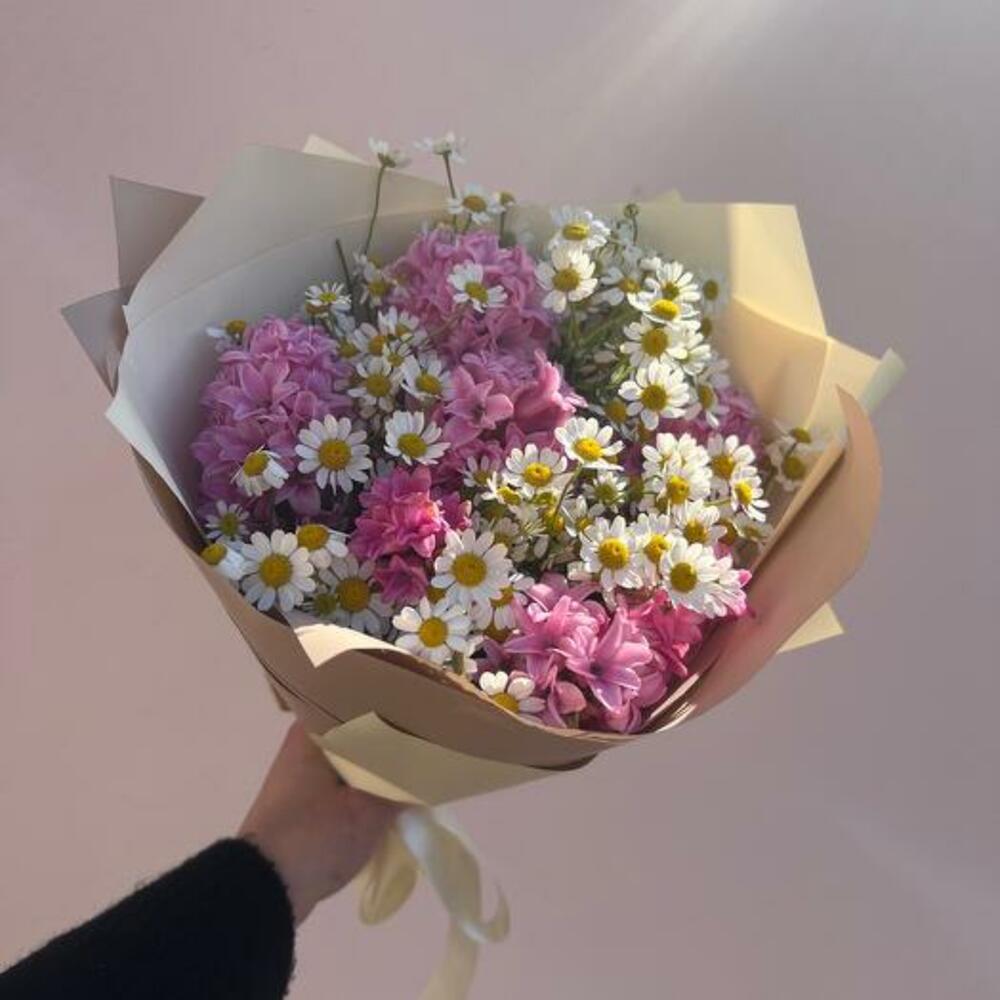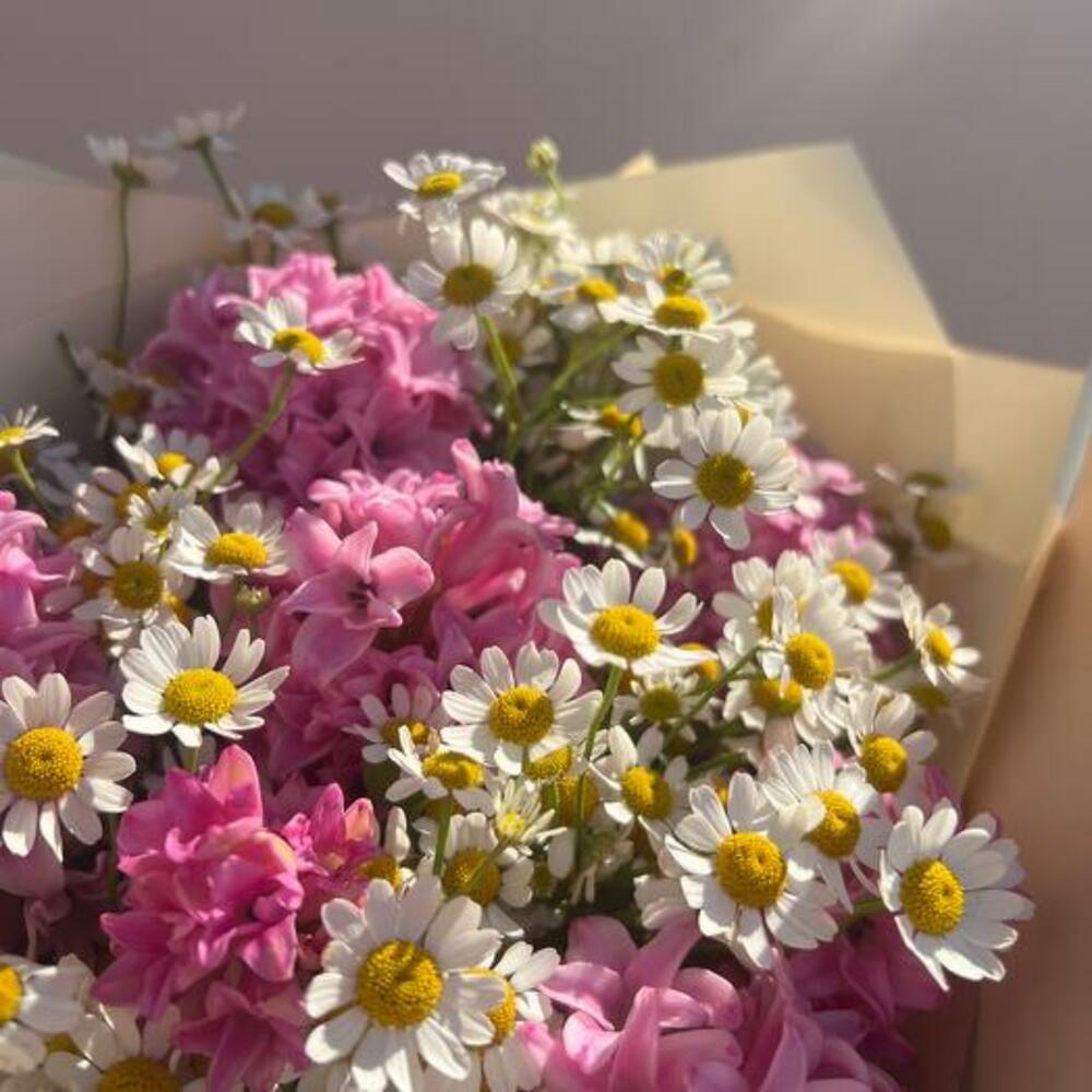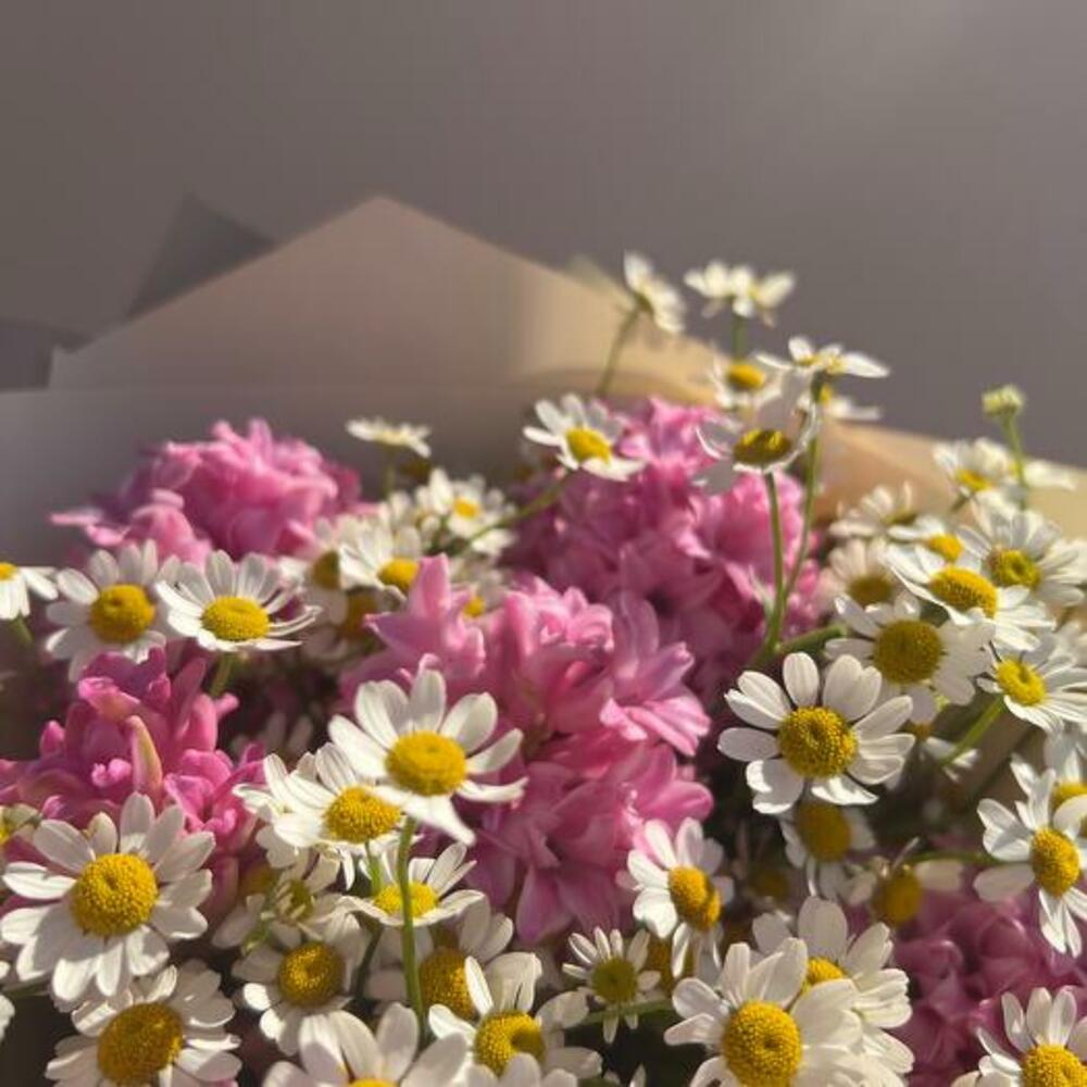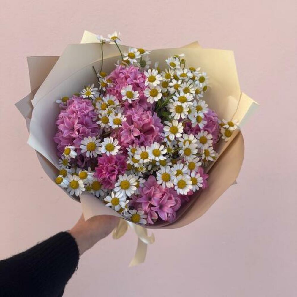 Satin ribbon - 1 pcs tanacetum - 5 pcs matte packaging - 5 pcs camomile - 10 pcs hiacynth - 7 pcs