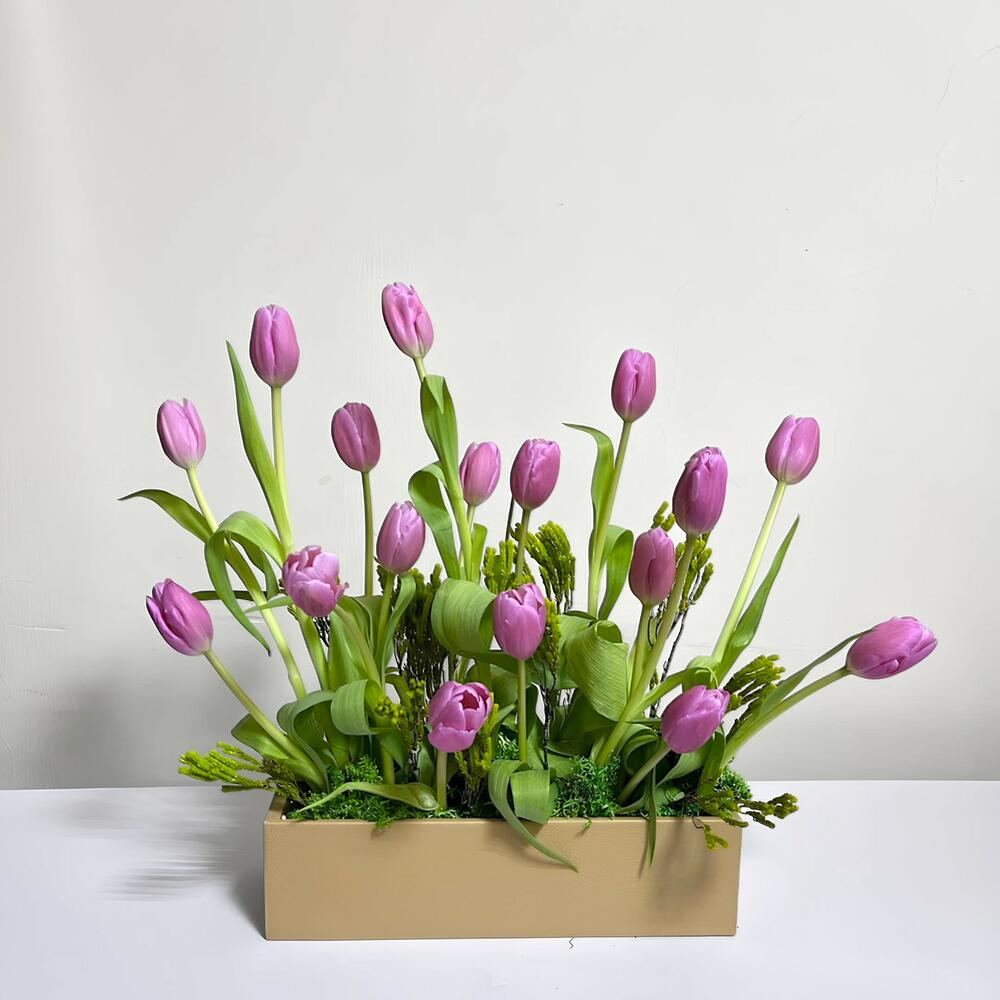 Spring Meadow is a minimalistic yet striking floral arrangement featuring delicate purple tulips rising naturally from a bed of fresh greenery and moss. This design mimics a blooming spring field, perfect for modern interiors or as a refreshing seasonal gift. Its sleek rectangular box makes it ideal for desks, shelves, and windowsills.