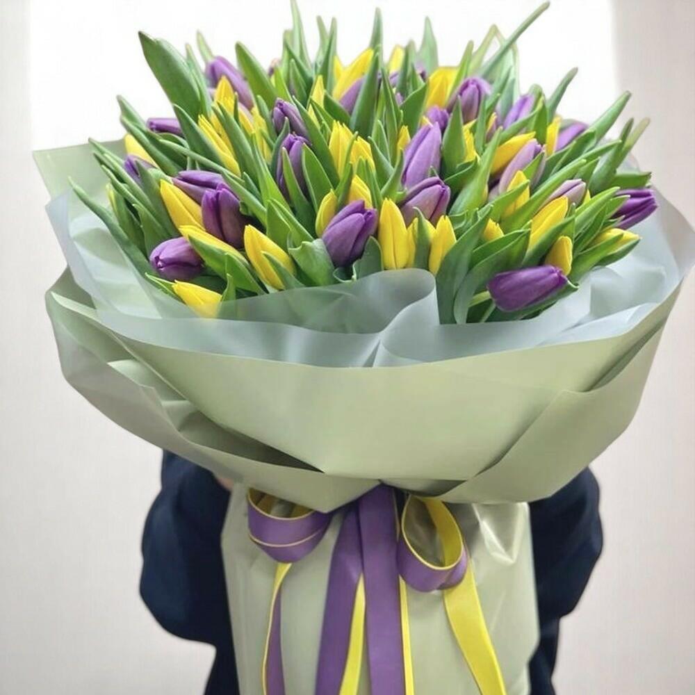 A striking bouquet bursting with vivid yellow and deep purple tulips — the perfect harmony of sunshine and elegance. This radiant arrangement brings cheer and sophistication to any celebration, from birthdays to springtime surprises. The tulips are hand-tied in soft green wrapping and finished with a two-tone ribbon for a bold yet graceful touch. To extend their freshness, place the bouquet in cool water immediately after delivery, trim stems diagonally every 2 days, and keep away from heat sources or direct sunlight.