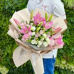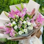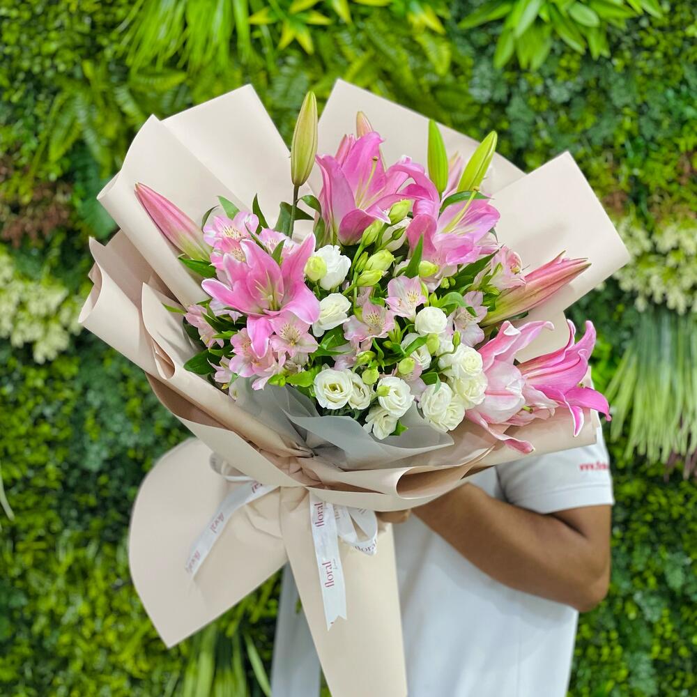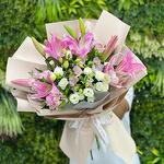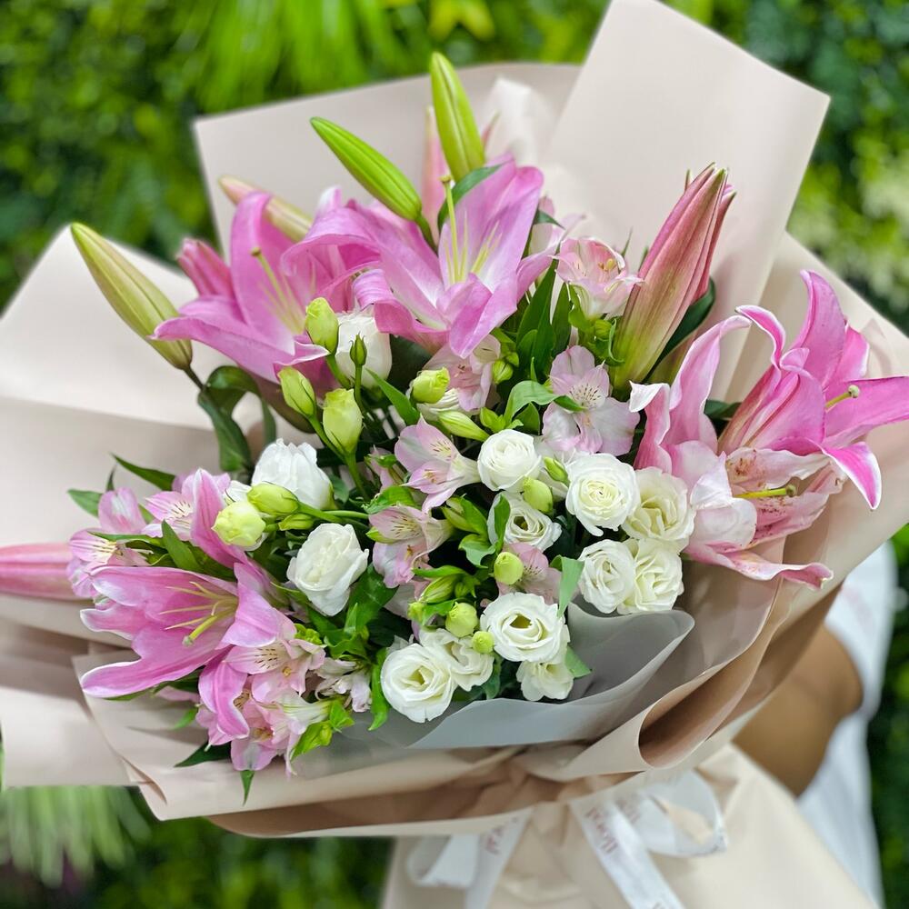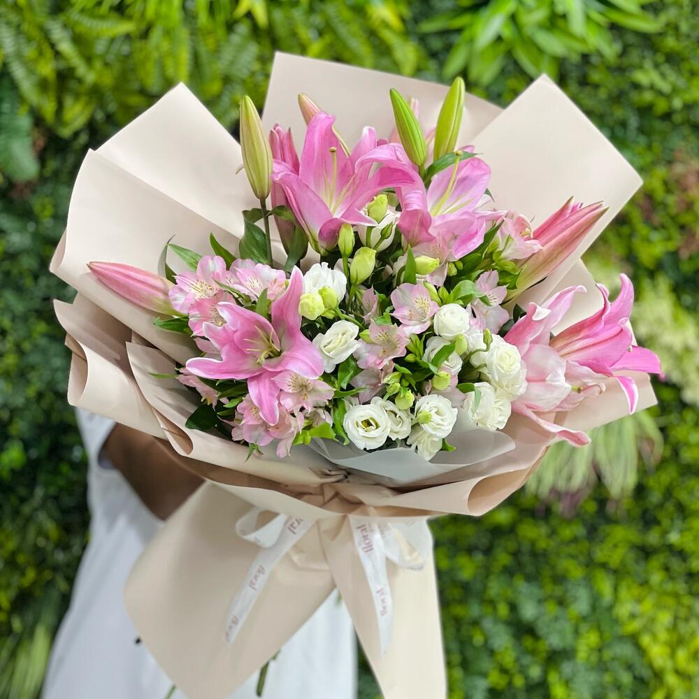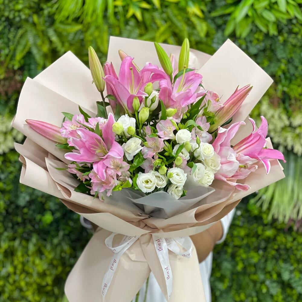 pink alstroemeria - 4 pcs white lisianthus - 5 pcs pink lilies - 4 pcs