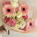 White rose - 4 pcs carnation pink - 8 pcs daisy - 2 pcs wrapping paper - 3 pcs gerbera pink - 3 pcs