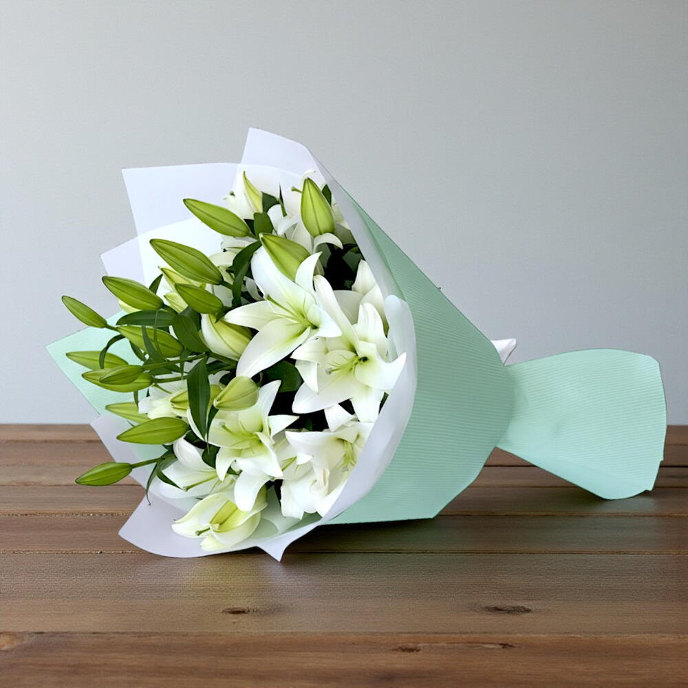 white ribbon - 1 pcs white lily - 9 pcs white wrapping - 1 pcs green wrapping - 1 pcs