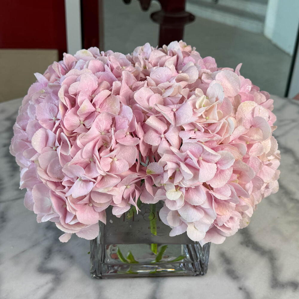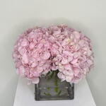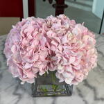 Clear square vase with 5 pink Hydrangeas.