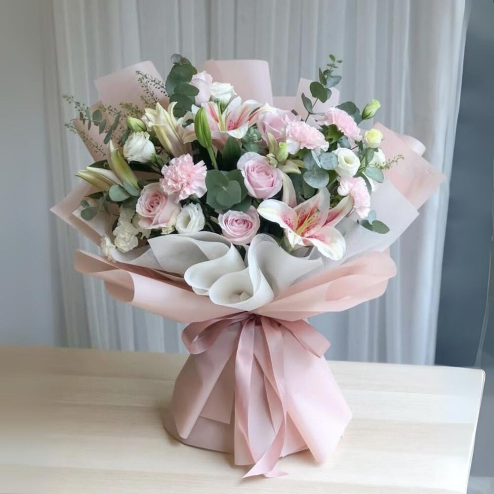 A stunning blend of pink lilies, carnations, and roses paired with white lisianthus and fresh eucalyptus fillers, beautifully wrapped to perfection. This bouquet radiates grace, love, and elegance — ideal for her, anniversaries, birthdays, or to say thank you in the most beautiful way.