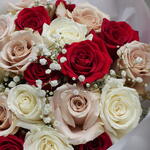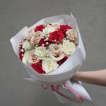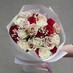Red rose - 10 pcs White rose - 6 pcs Gypsophila - 3 pcs peach pink roses - 5 pcs