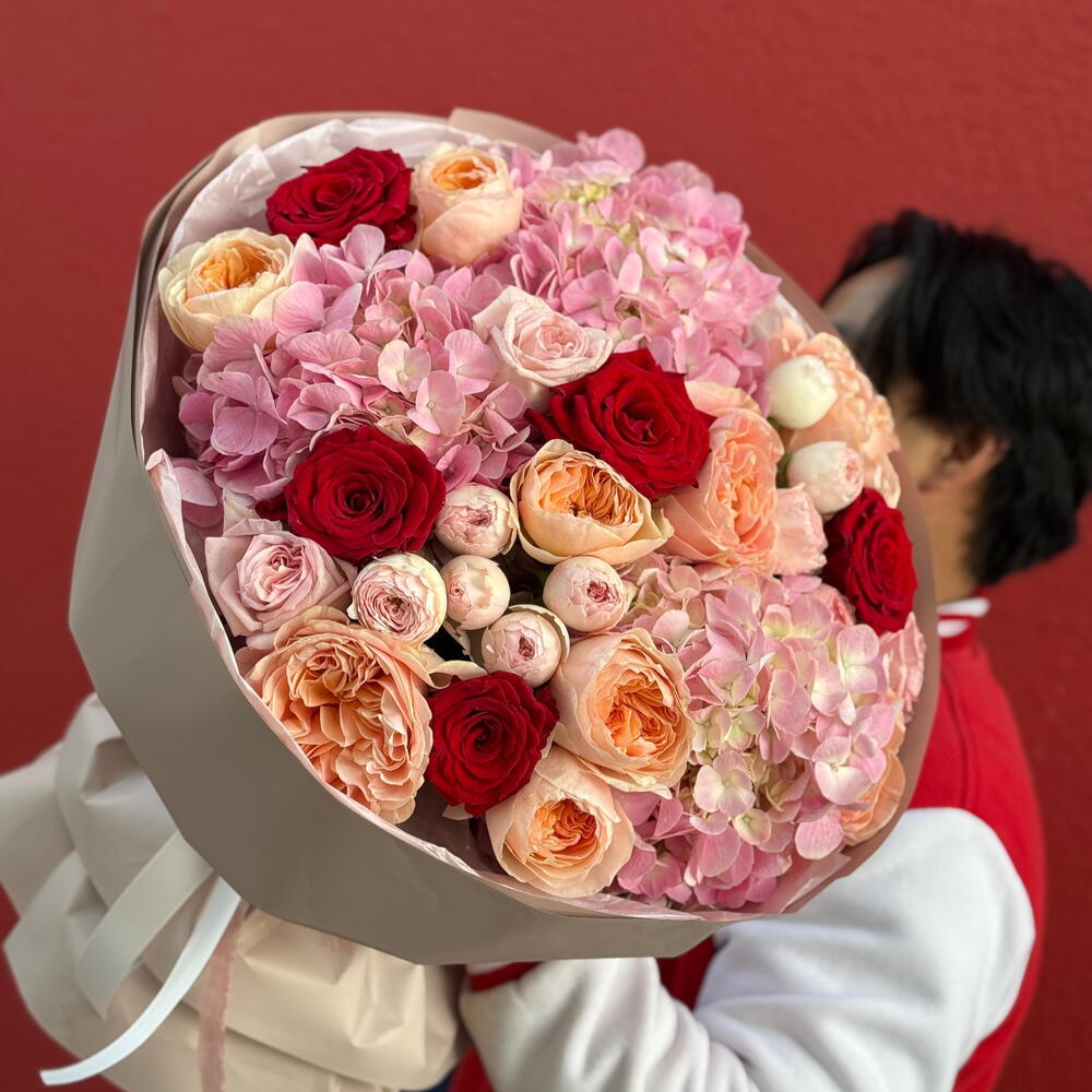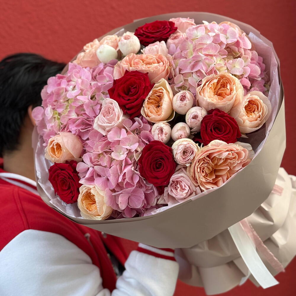 The Strawberry & Velvet Romance Bouquet is a refined and expressive arrangement that beautifully balances softness and passion. Delicate pink hydrangeas create an airy, pastel backdrop, while creamy garden roses add warmth and tenderness. Deep red roses bring a rich, velvety accent, symbolizing love and devotion, and elegant ranunculus complete the composition with texture and grace.