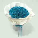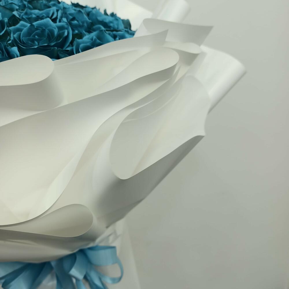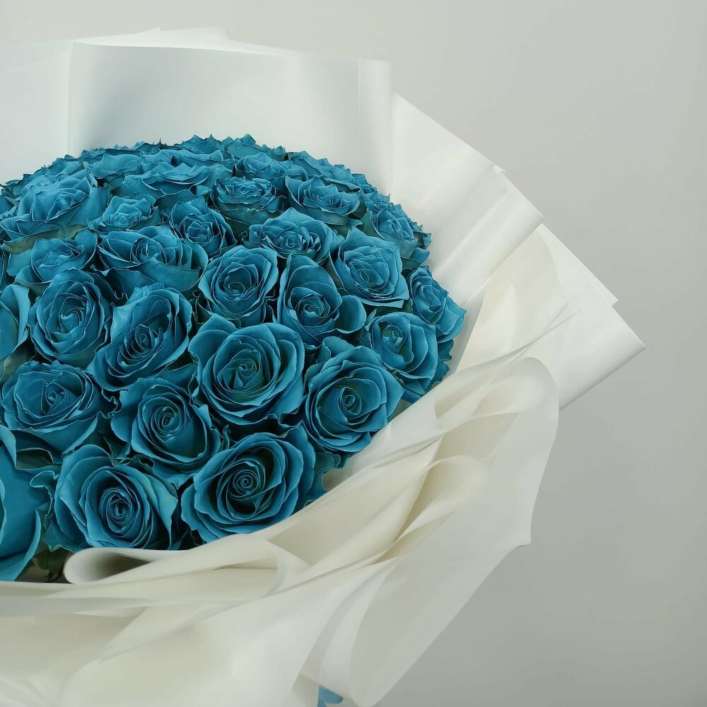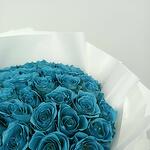 This striking bouquet is a beautiful and contemporary arrangement of vibrant aqua blue roses, meticulously clustered together. The roses are wrapped in a sophisticated combination of white and brown paper, creating an elegant layered effect. A delicate blue ribbon adds a final touch of charm, making this a unique and memorable gift for someone special.