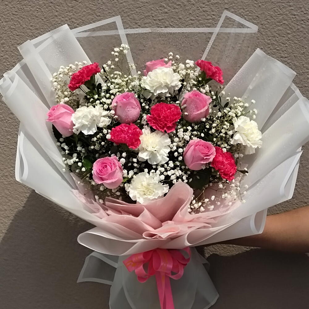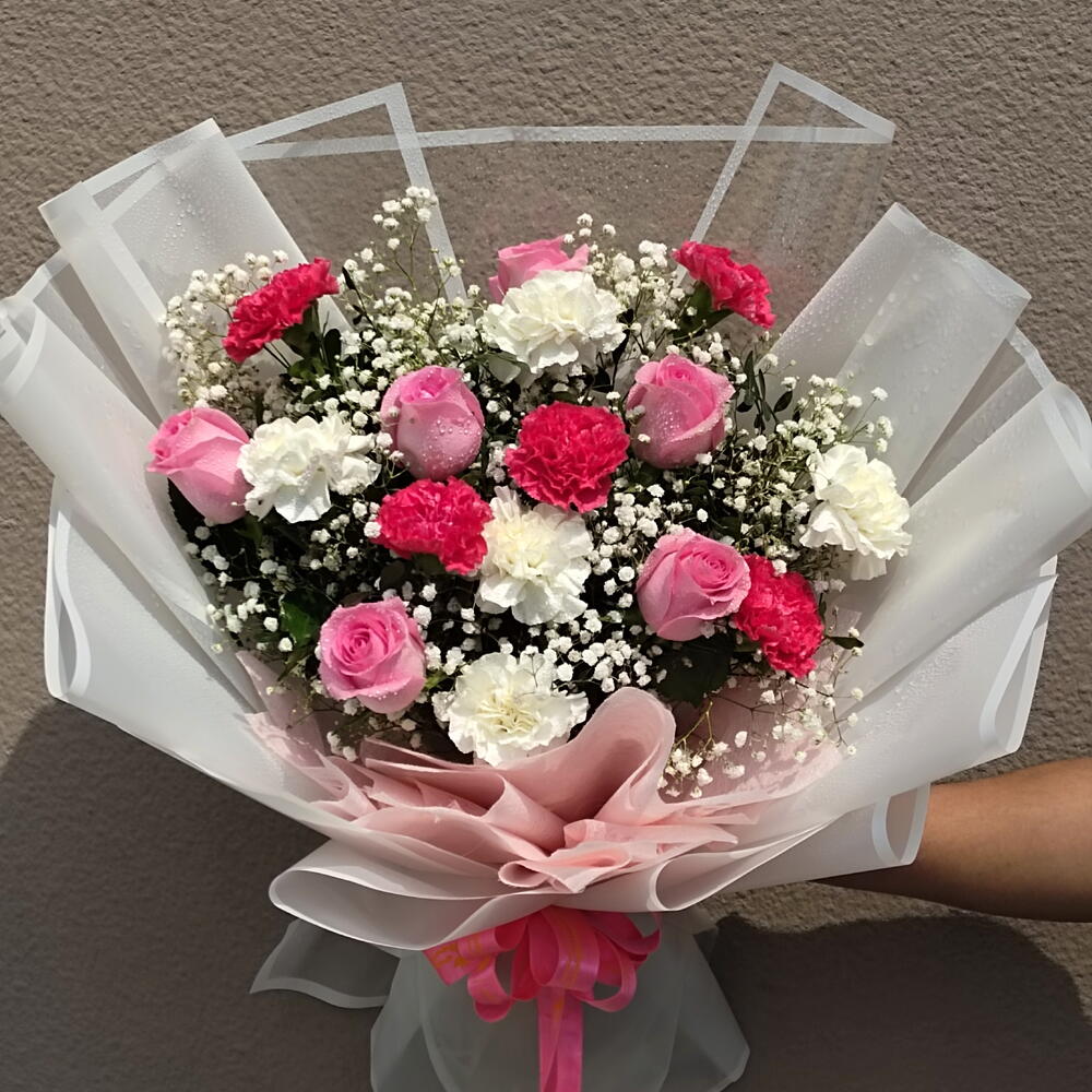 Pink rose - 6 pcs pink carnation - 5 pcs white carnation - 5 pcs