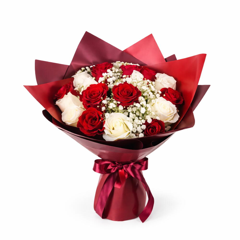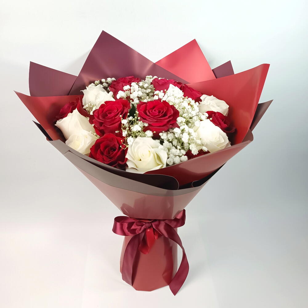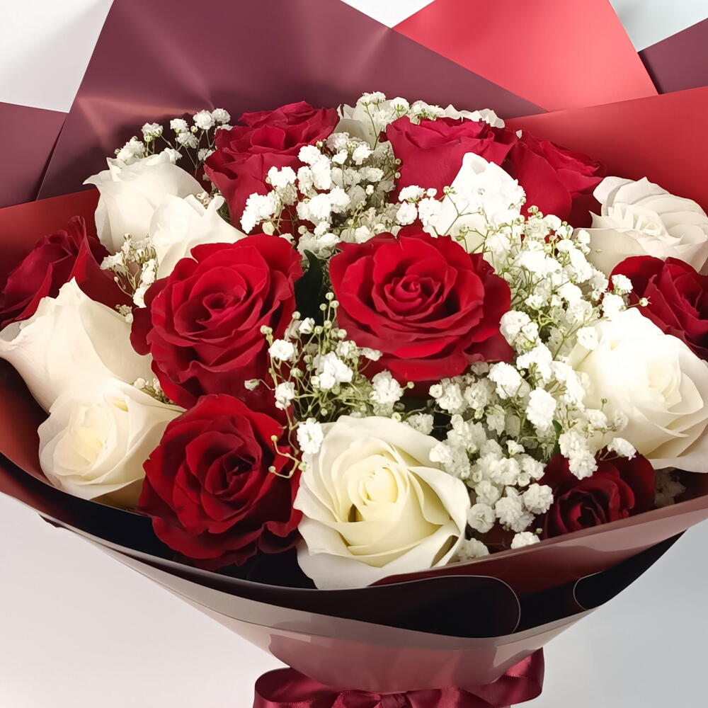 Red rose - 9 pcs rose white - 9 pcs gypsophila white - 5 pcs