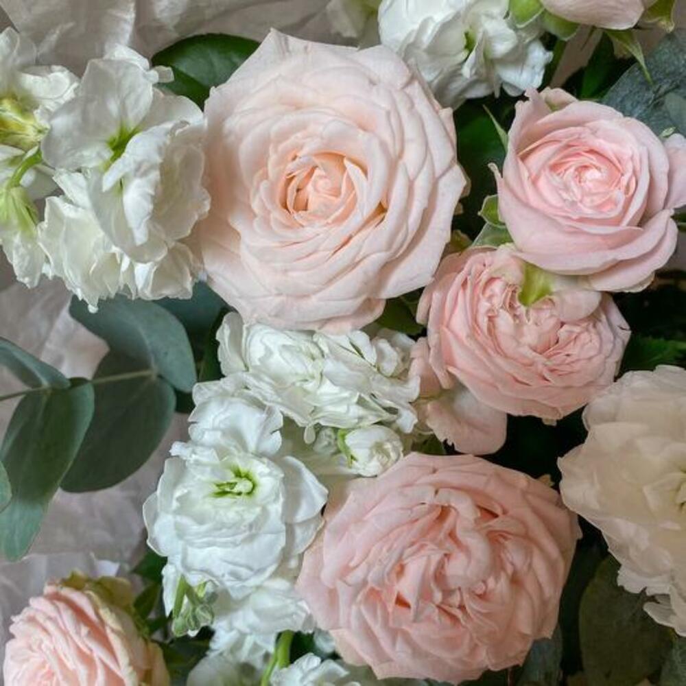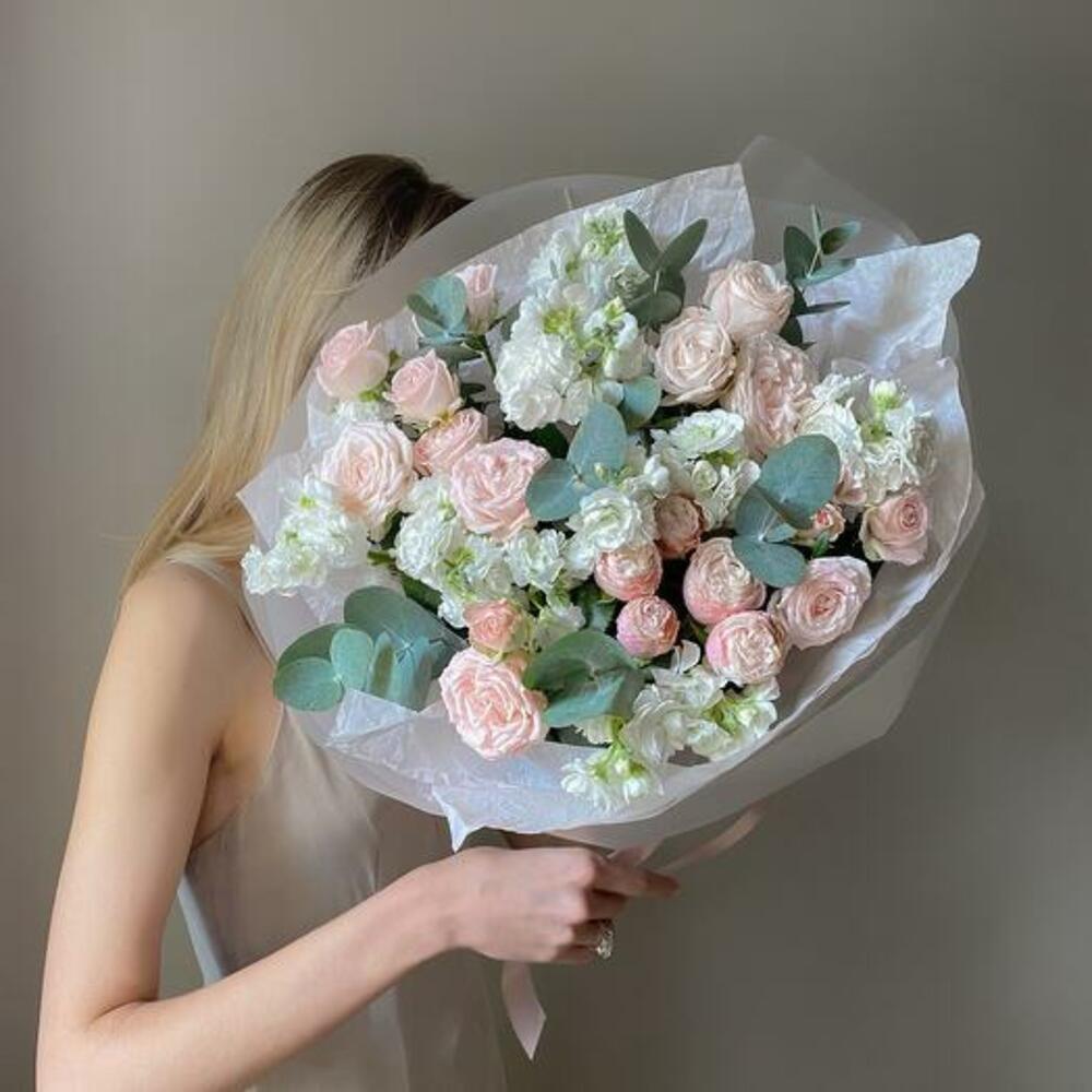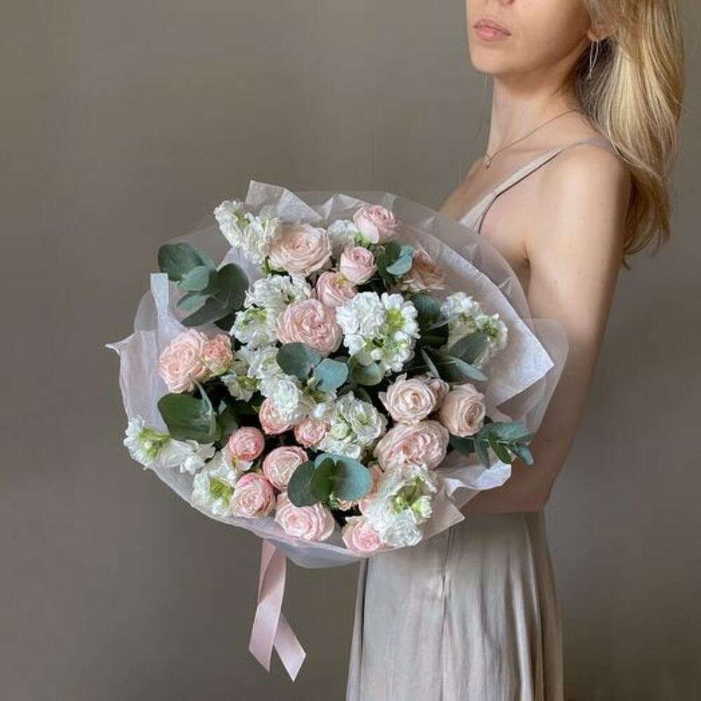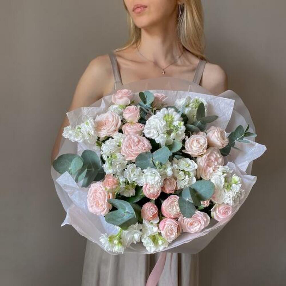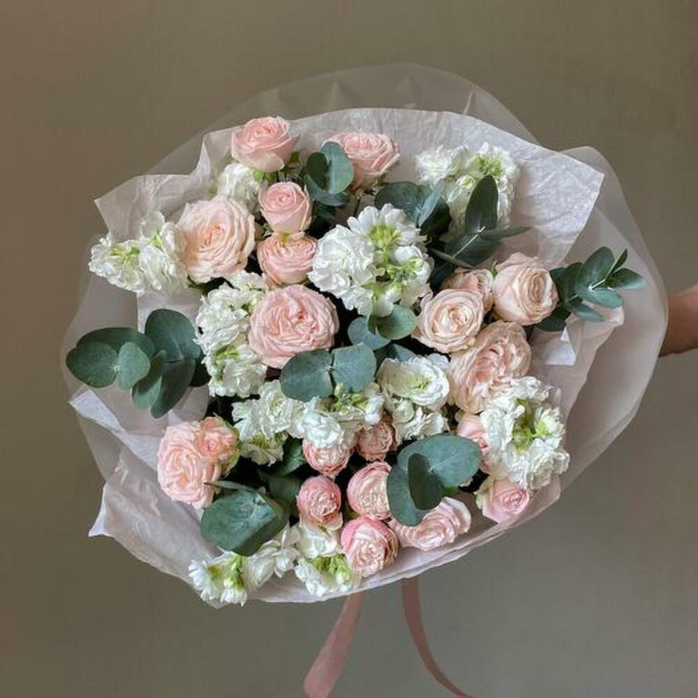 Satin ribbon - 1 pcs Eucalyptus - 5 pcs Spray rose - 9 pcs matthiola - 5 pcs design packaging - 1 pcs