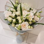Wrapping - 1 pcs white lisianthus - 4 pcs white hydrangea - 1 pcs white spray roses - 6 pcs large white/cream roses - 7 pcs green decorative foliage leaves - 5 pcs