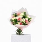 ruscus stems - 3 pcs pink roses - 5 pcs white roses - 5 pcs white eustoma stem - 3 pcs white baby roses stems - 3 pcs euclyptus stem - 3 pcs