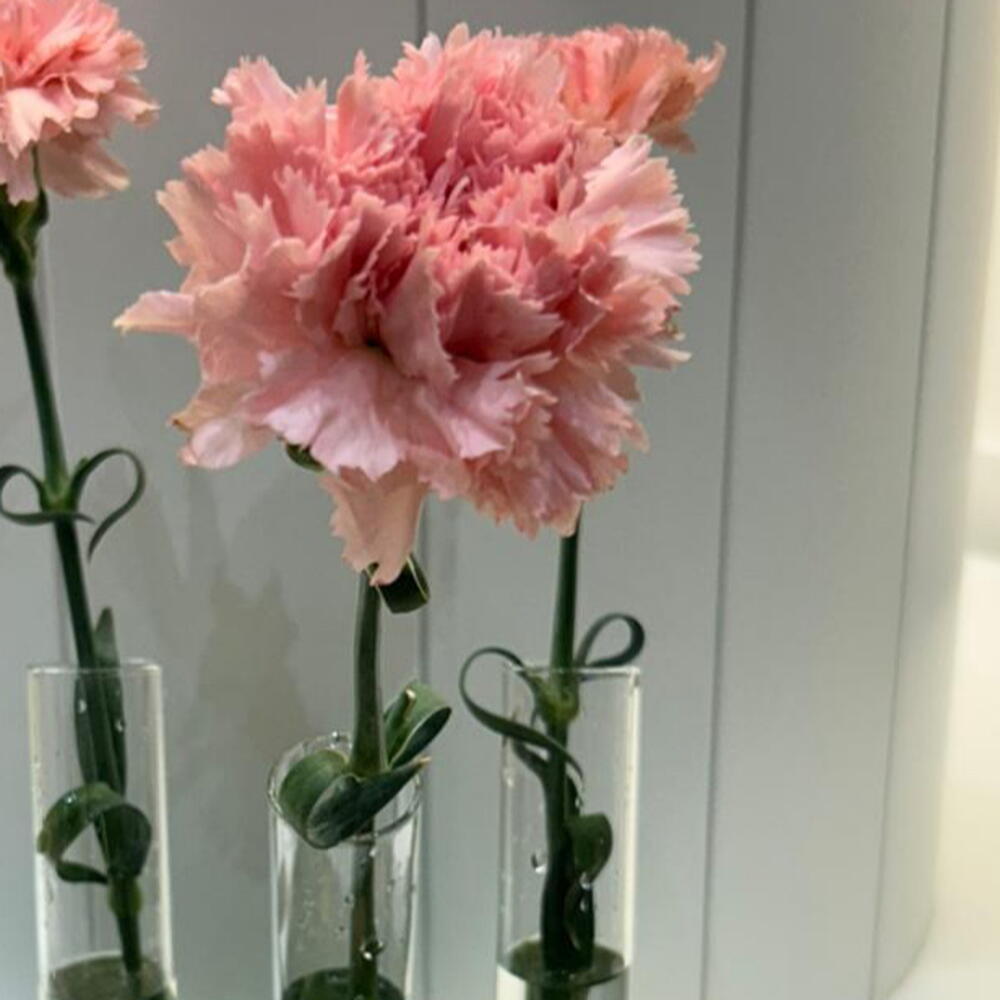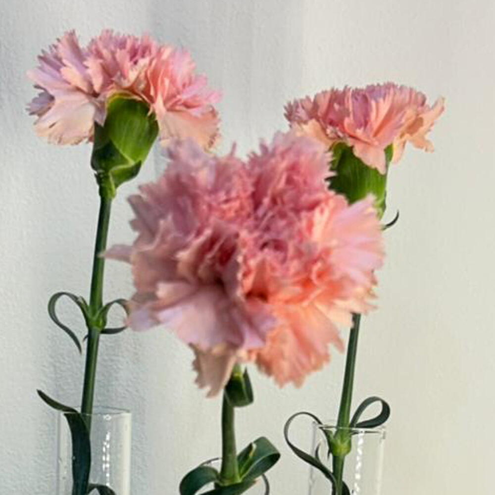 Elegant pink carnation arrangement in sleek glass tubes on a natural moss base, creating a modern and stylish centerpiece perfect for home décor, gifts, or special occasions.