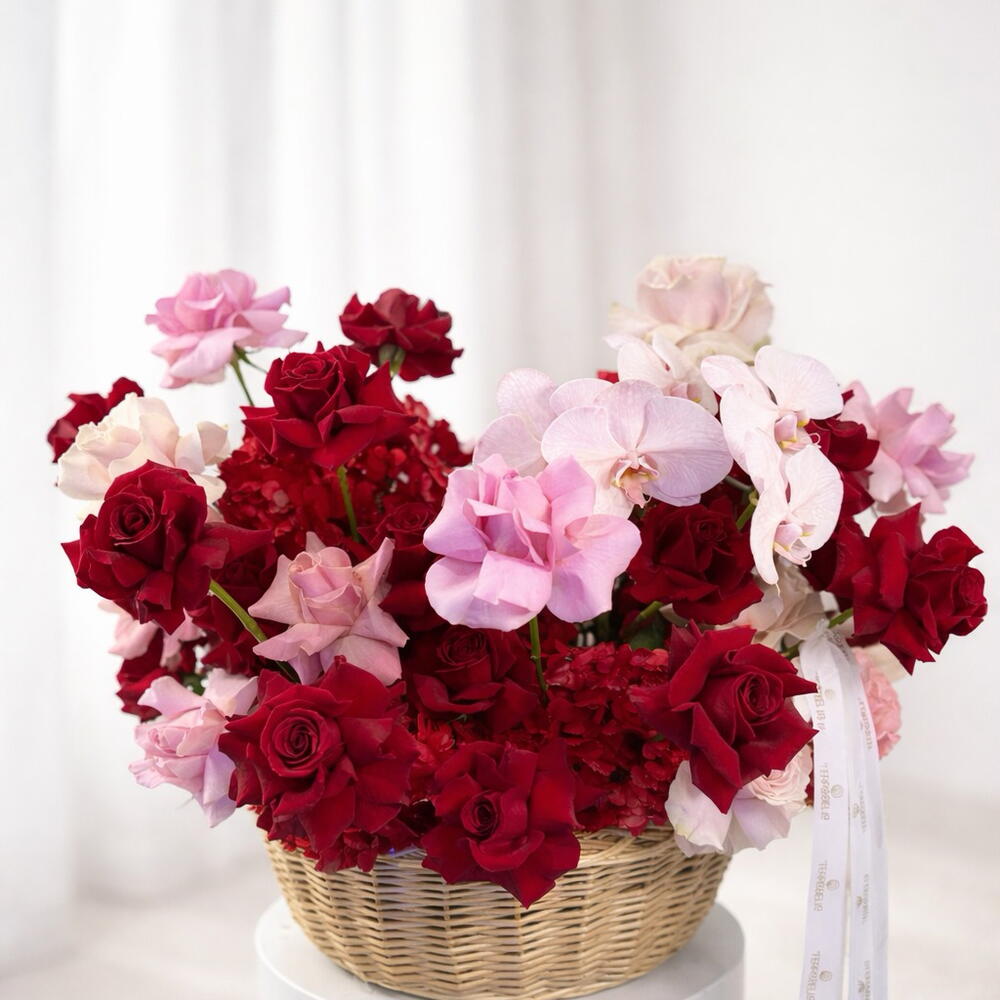 A captivating harmony of passion and softness, Sugar and Flame is a statement arrangement that blends deep red roses with delicate blush pink roses and elegant Phalaenopsis orchids. The rich crimson blooms symbolize desire and strength, while the soft pink tones add a touch of sweetness and grace — creating the perfect balance between bold emotion and gentle romance. Arranged beautifully in a woven wicker basket, this design radiates warmth, luxury, and femininity. Ideal for romantic gestures, grand celebrations, or simply expressing love in its most refined form, Sugar and Flame is where intensity meets tenderness in one unforgettable floral masterpiece.