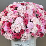 Sugar Bloom is a lavish pink fantasy—a luxurious dome-shaped composition bursting with lush hydrangeas, delicate spray roses, fragrant garden roses, and airy chrysanthemums. Shades of blush, magenta, and candy pink blend into a breathtaking expression of joy and romance, presented in our signature white hatbox. This arrangement is the ultimate celebration of femininity and sweet affection—a stunning gift perfect for birthdays and romantic gestures.