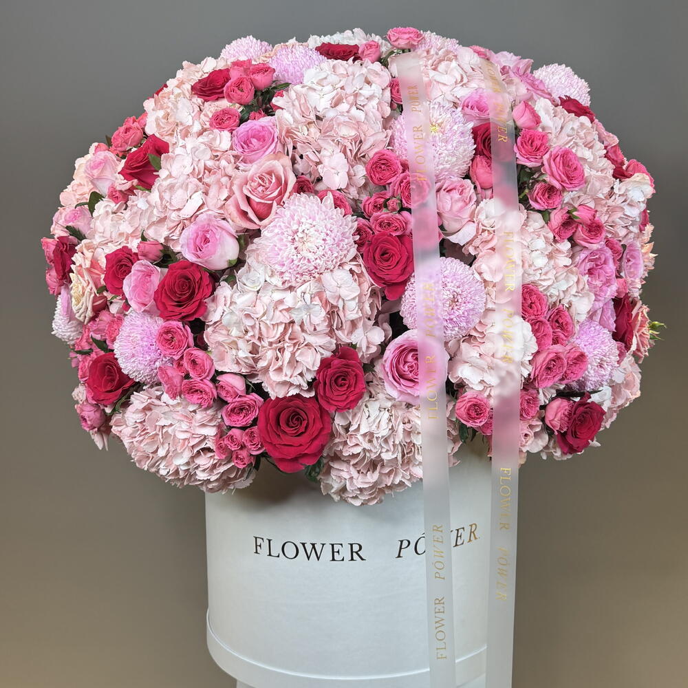 Sugar Bloom is a lavish pink fantasy—a luxurious dome-shaped composition bursting with lush hydrangeas, delicate spray roses, fragrant garden roses, and airy chrysanthemums. Shades of blush, magenta, and candy pink blend into a breathtaking expression of joy and romance, presented in our signature white hatbox. This arrangement is the ultimate celebration of femininity and sweet affection—a stunning gift perfect for birthdays and romantic gestures.