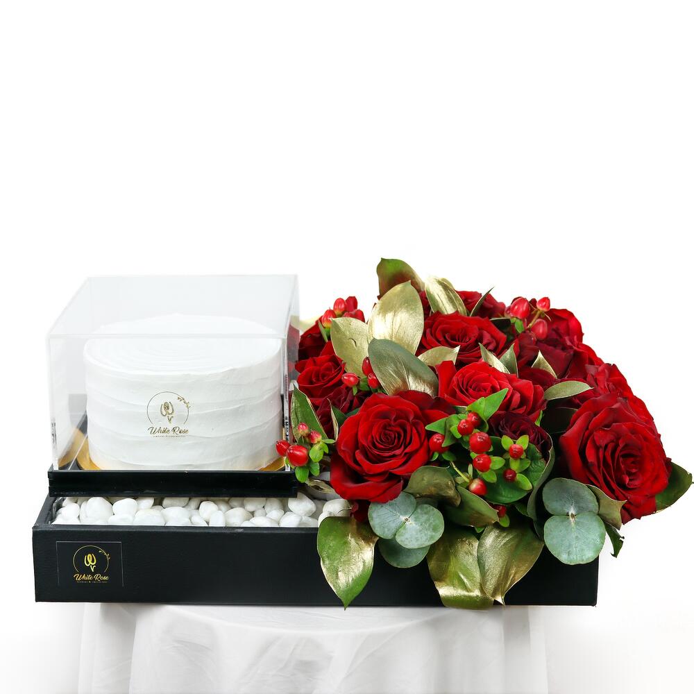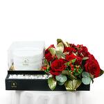 Red roses arranged with a 300g Mini cake in a tray