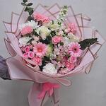 Pink rose - 3 pcs White rose - 5 pcs Chrysanthemum white - 1 pcs carnation white - 4 pcs carnation pink - 4 pcs matthiola - 1 pcs gerbera pink - 3 pcs eucalyptus leaves - 2 pcs baby rose pink - 4 pcs astromeriya pink - 3 pcs