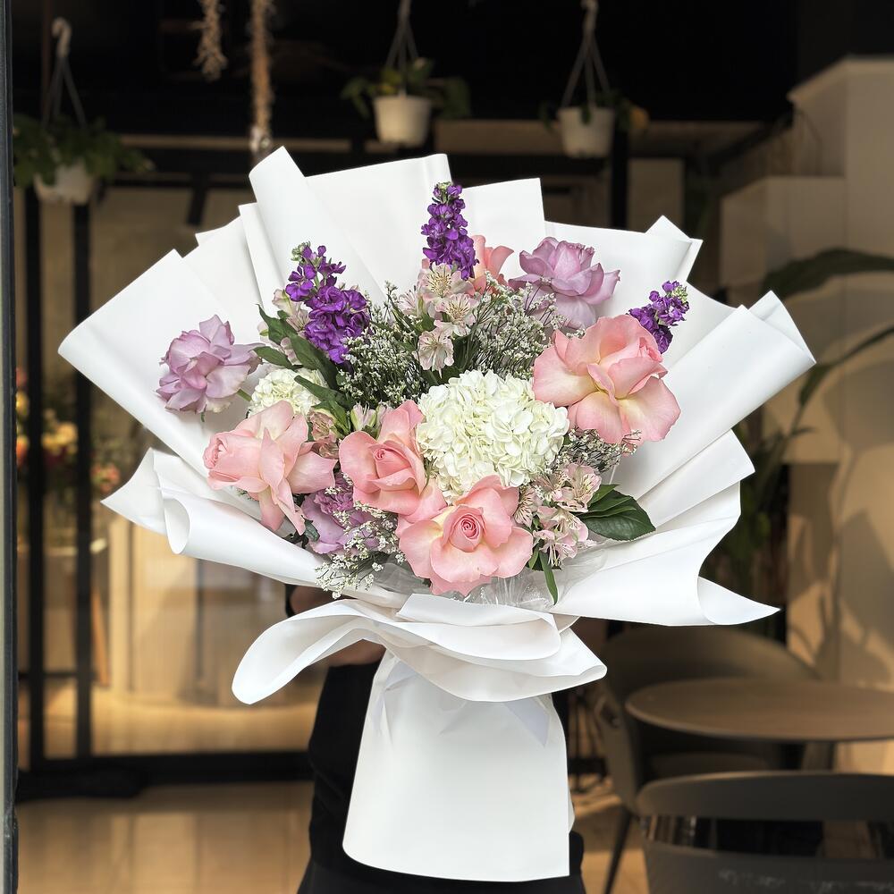 This exquisite floral arrangement from our Florists Specials category masterfully combines 2 beautiful pieces of Limonium, 8 tender pink roses, 2 pristine white hydrangea, 3 vibrant purple mathiola, and 4 alluring pink alstroemeria. Each flower is carefully selected and harmoniously brought together to create an awe-inspiring bouquet that perfectly captures the beauty of the seasons, making it an ideal gift for any occasion. Unwrap the joy and let the beautiful aroma fill your space, allowing the natural elegance of this bouquet to bring a bit of magical charm into your everyday life.