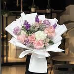 Limonium - 2 pcs Pink rose - 8 pcs hydrangea white - 2 pcs mathiola purple - 3 pcs alstroemeria pink - 4 pcs