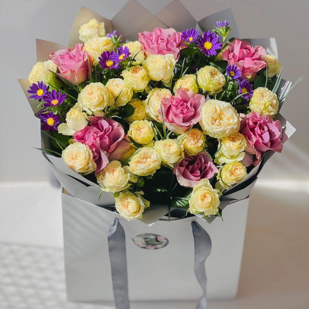 dark purple aster - 4 pcs purple rose. - 7 pcs summer peache rose. - 7 pcs
