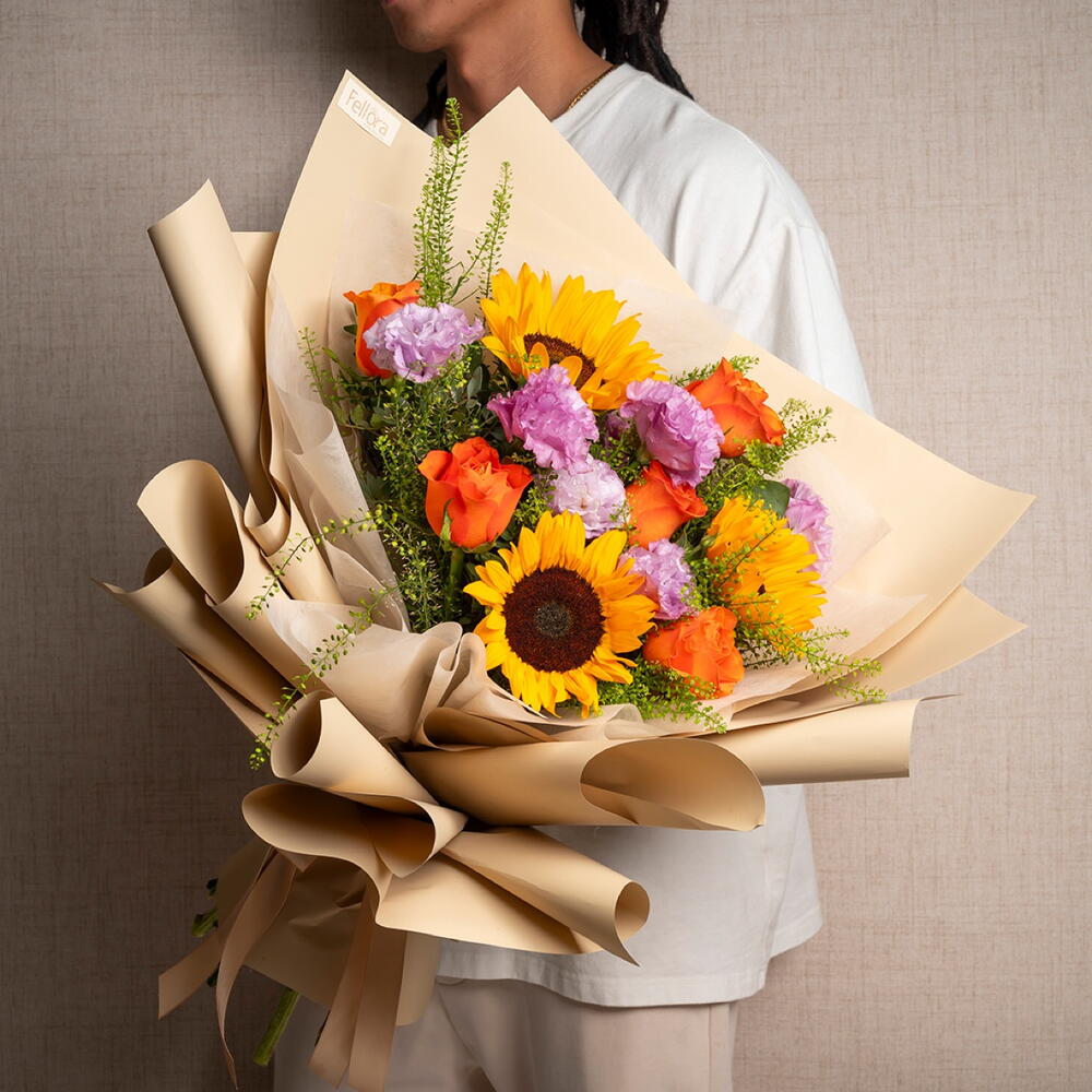 Sunflower - 3 pcs orange rose - 5 pcs ribbon satin - 1 pcs lisianthus purple - 2 pcs lipidium - 4 pcs decoration wrapping - 8 pcs