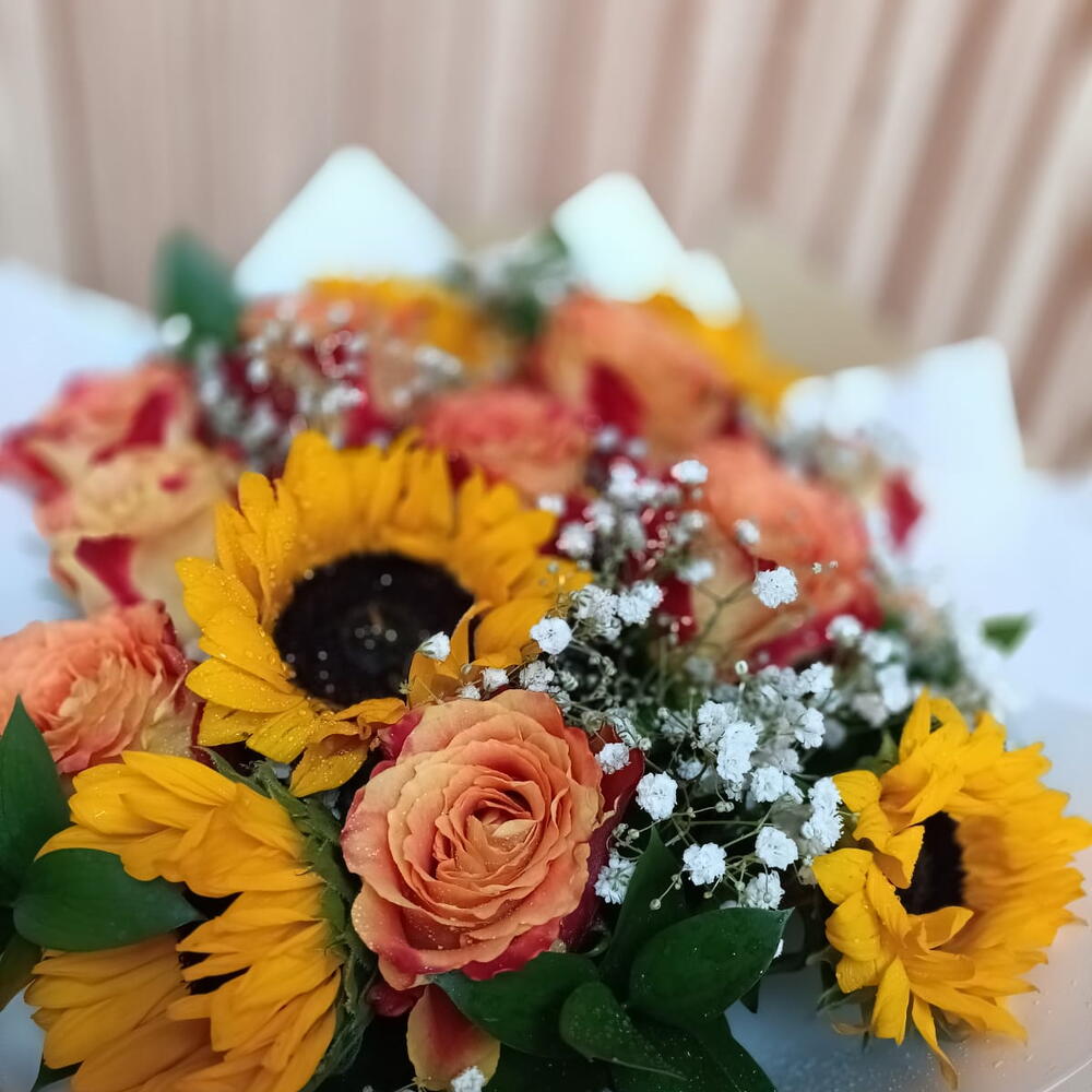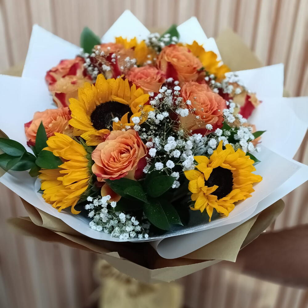 orange rose - 5 pcs foliage - 5 pcs fillers - 5 pcs sun flower - 5 pcs