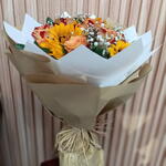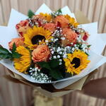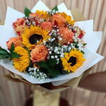 Exquisitely crafted, this Florists special bouquet emanates warmth and joy through five radiant sunflowers and five striking orange roses. The arrangement is further enhanced with five complementary fillers and lush foliage, creating a captivating balance of color and volume. An ideal choice to express your admiration, love or gratitude to someone special.