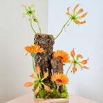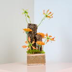 Brighten any space with this joyful arrangement of vibrant orange gerbera daisies, radiating warmth and energy. Paired with sleek black decorative accents and dried bunny tail, this striking contrast adds a bold, modern flair to the arrangement. Set in a rustic, lace-adorned box, this playful yet elegant design is perfect for lifting spirits, whether as a gift or a delightful décor piece for any occasion. Gift Details: Orange Gerbera Dried Bunny Tail Stick Moss Wooden Box