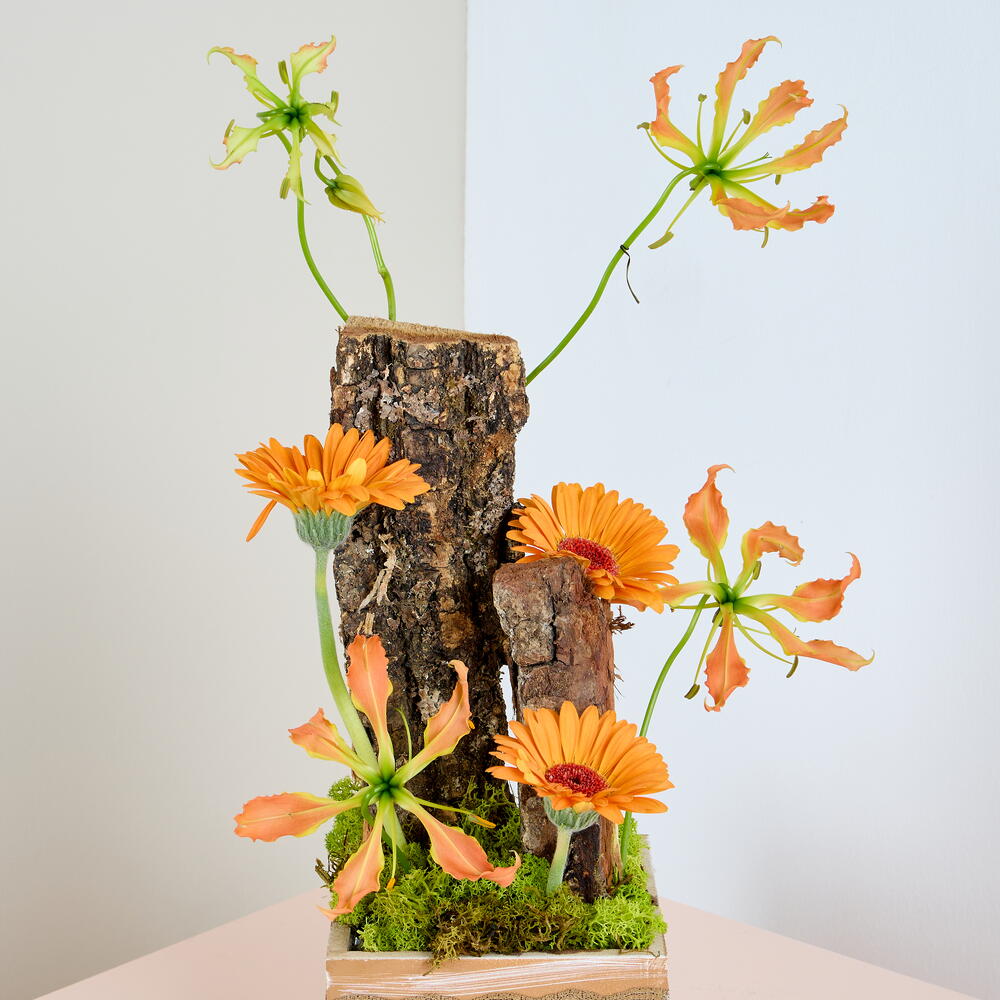 Moss - 1 pcs gerbera orange - 8 pcs dried bunny tail - 7 pcs stick - 7 pcs wood box - 1 pcs