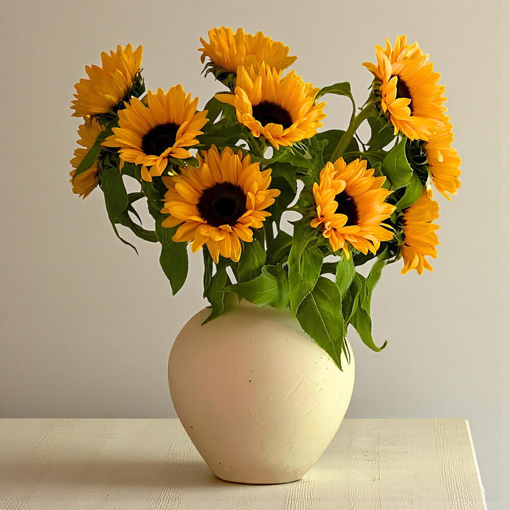 A cheerful and radiant arrangement of 11 golden sunflowers displayed in a charming pot, bringing warmth, optimism, and joy to any space. These vibrant blooms are a symbol of adoration and loyalty, their sunny faces turning toward the light and filling a room with a feeling of pure happiness. This potted arrangement is the perfect gift to brighten someone’s day, celebrate a milestone, or simply add a touch of natural beauty and cheer to a home or office. Its a gift that keeps on giving, as these flowers are as long-lasting as they are beautiful. Ready to send some happiness? Order this potted sunflower arrangement today and share the glow.