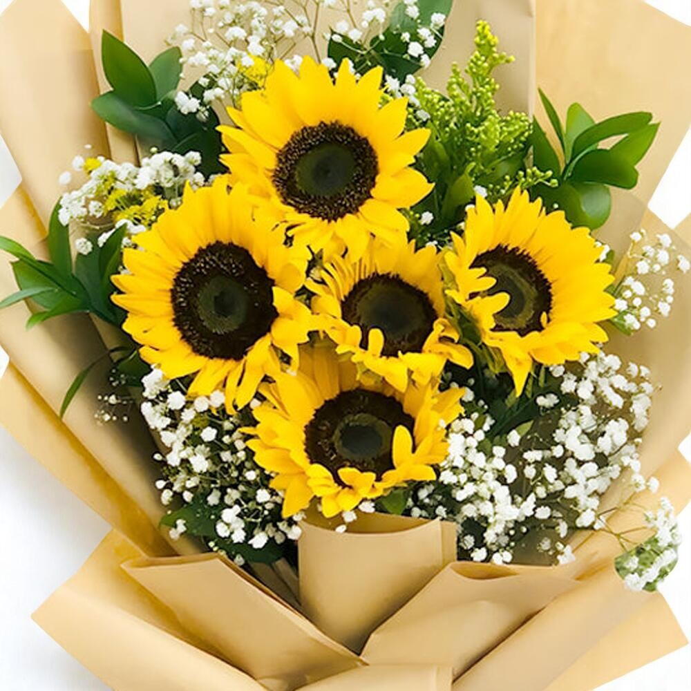 Bright Sunflower Bouquet – 5 Sunflowers with Baby s Breath Ruscus in Elegant Wrapping