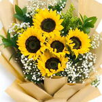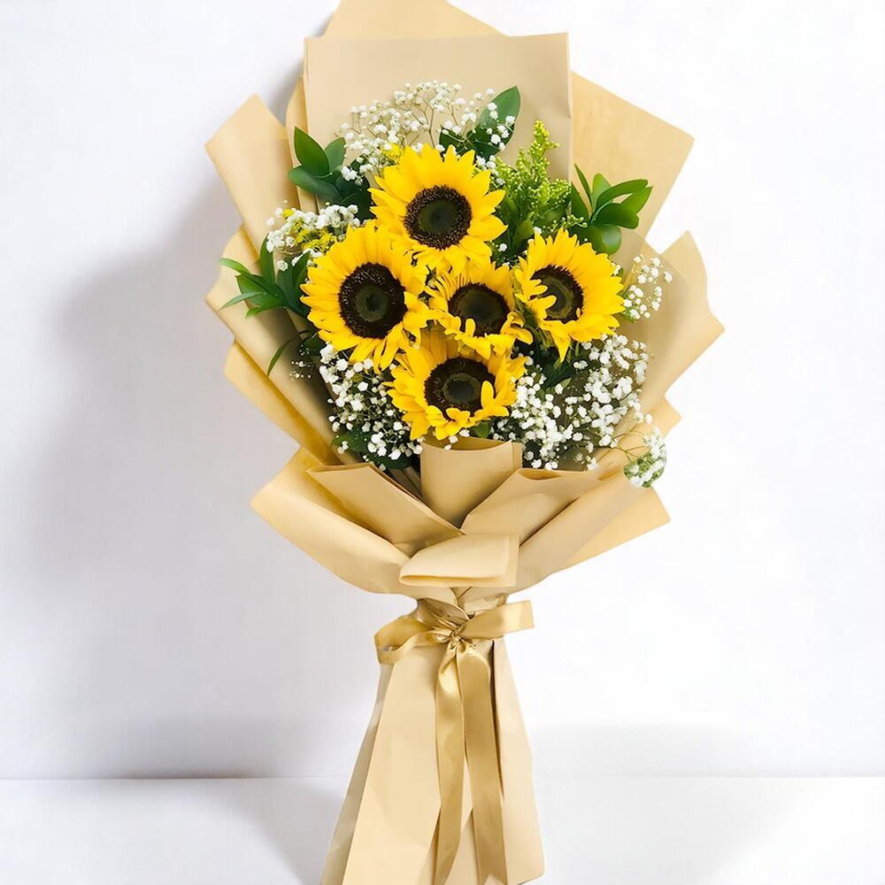 Bring sunshine and smiles with this vibrant 5 Sunflower Bouquet, perfect for birthdays, congratulations, or simply uplifting someone’s day. Featuring five radiant sunflowers complemented by delicate baby’s breath and lush ruscus foliage, this bouquet is wrapped in soft golden-toned paper and tied with a matching satin ribbon. A cheerful and timeless floral gift that radiates joy and warmth. Care Instructions: Trim the stems diagonally and place the bouquet in a clean vase with fresh water. Replace the water every day and keep the bouquet in a cool, well-ventilated area away from direct sunlight and heat. Remove any wilted petals to keep the bouquet fresh and vibrant.