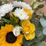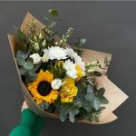 Chrysanthemum white - 1 pcs lisianthus white - 2 pcs sunflower yellow - 1 pcs leavs - 5 pcs yellow flowers - 3 pcs