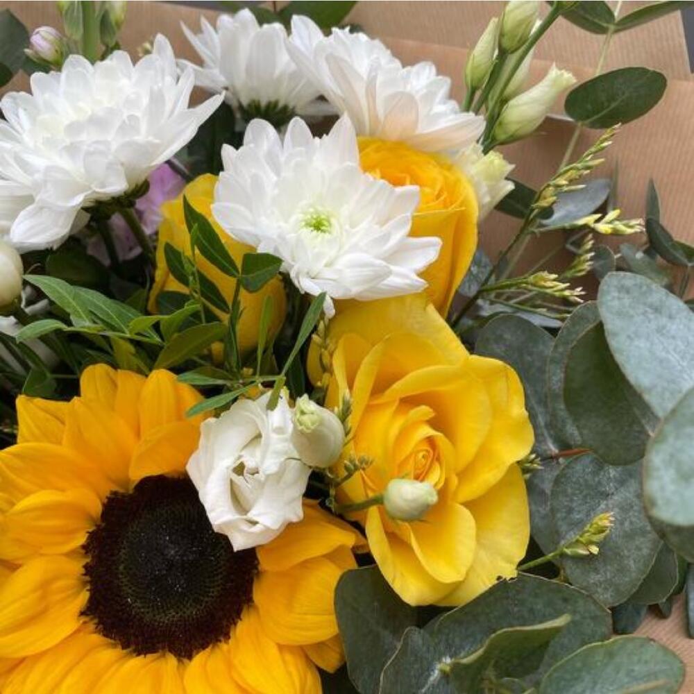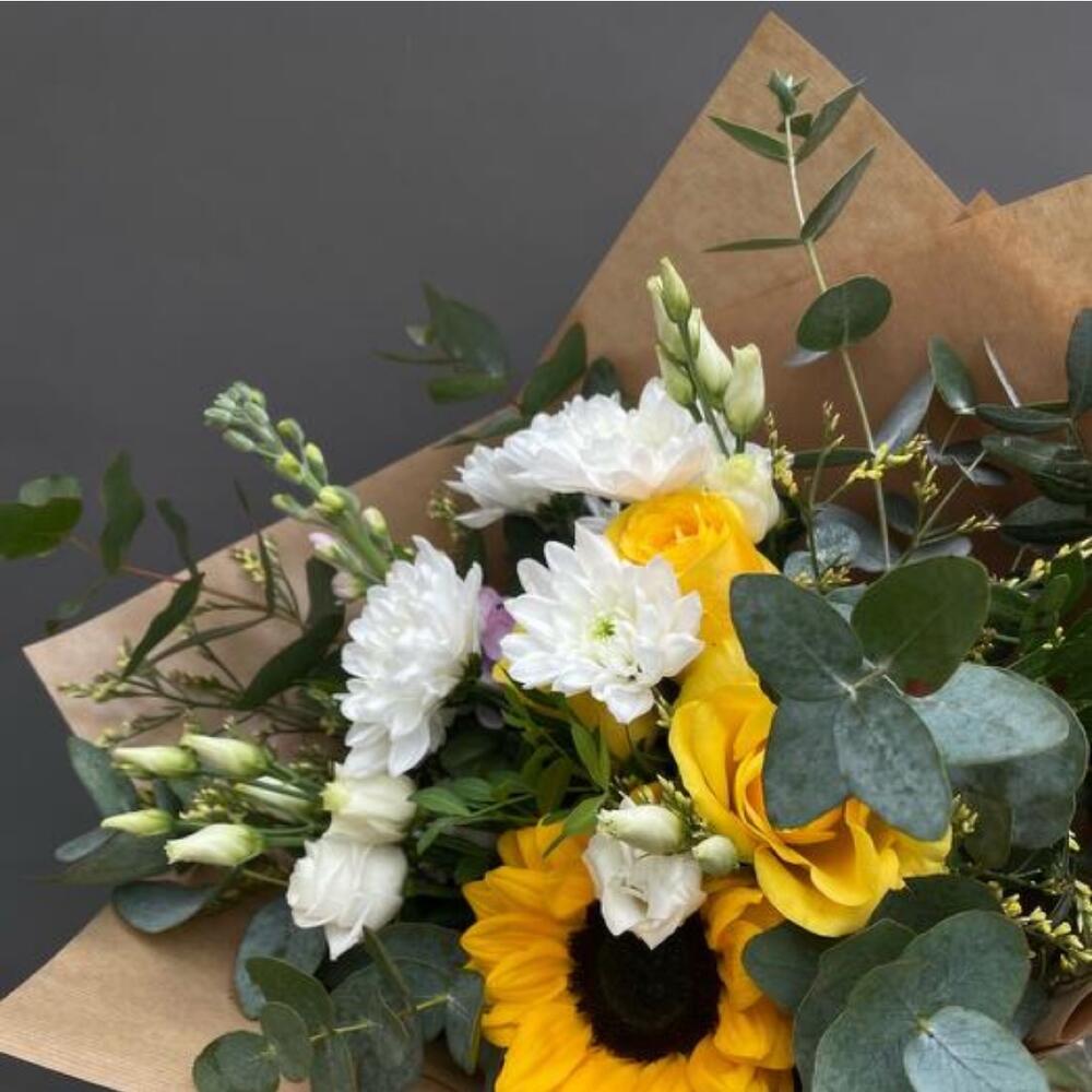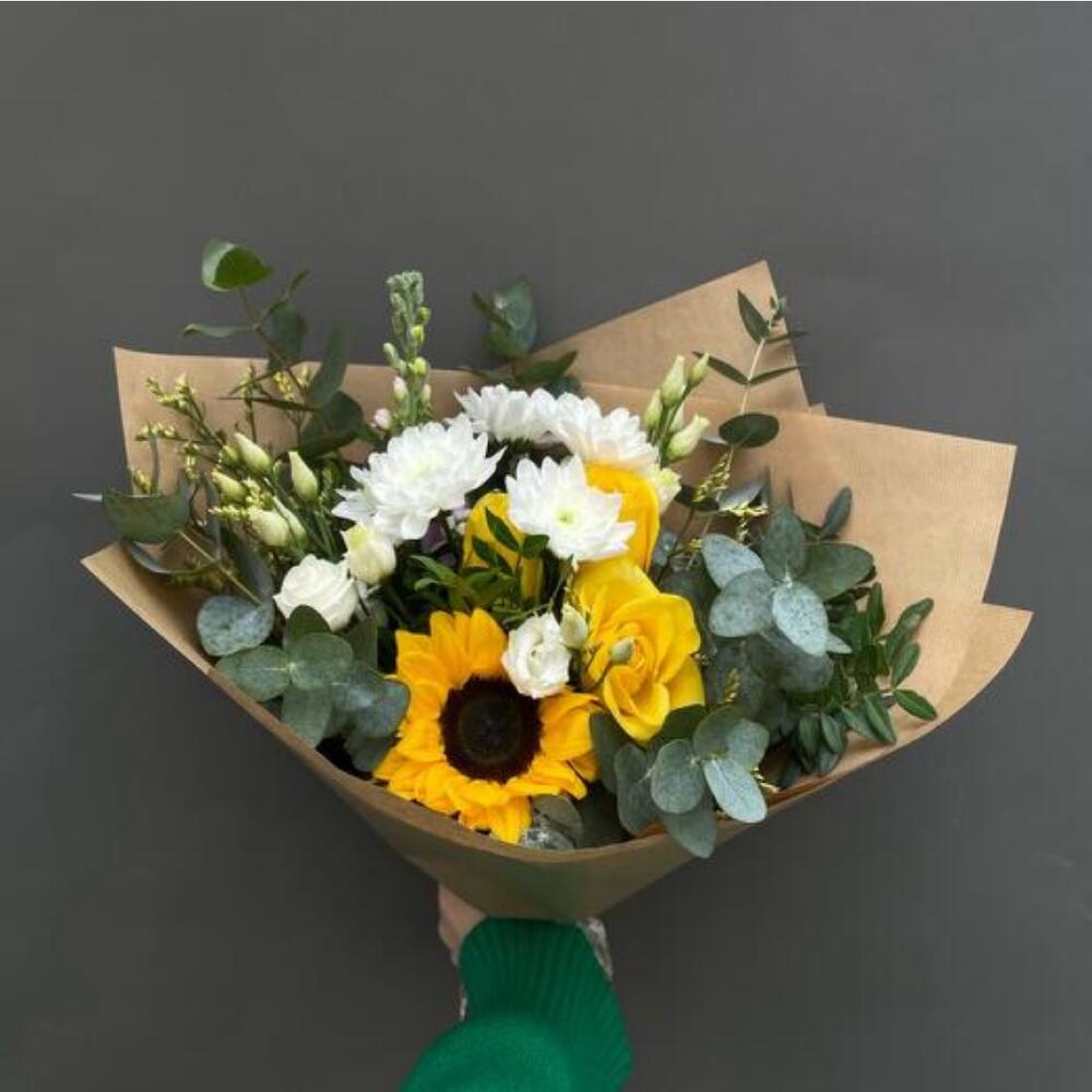 Chrysanthemum white - 1 pcs lisianthus white - 2 pcs sunflower yellow - 1 pcs leavs - 5 pcs yellow flowers - 3 pcs