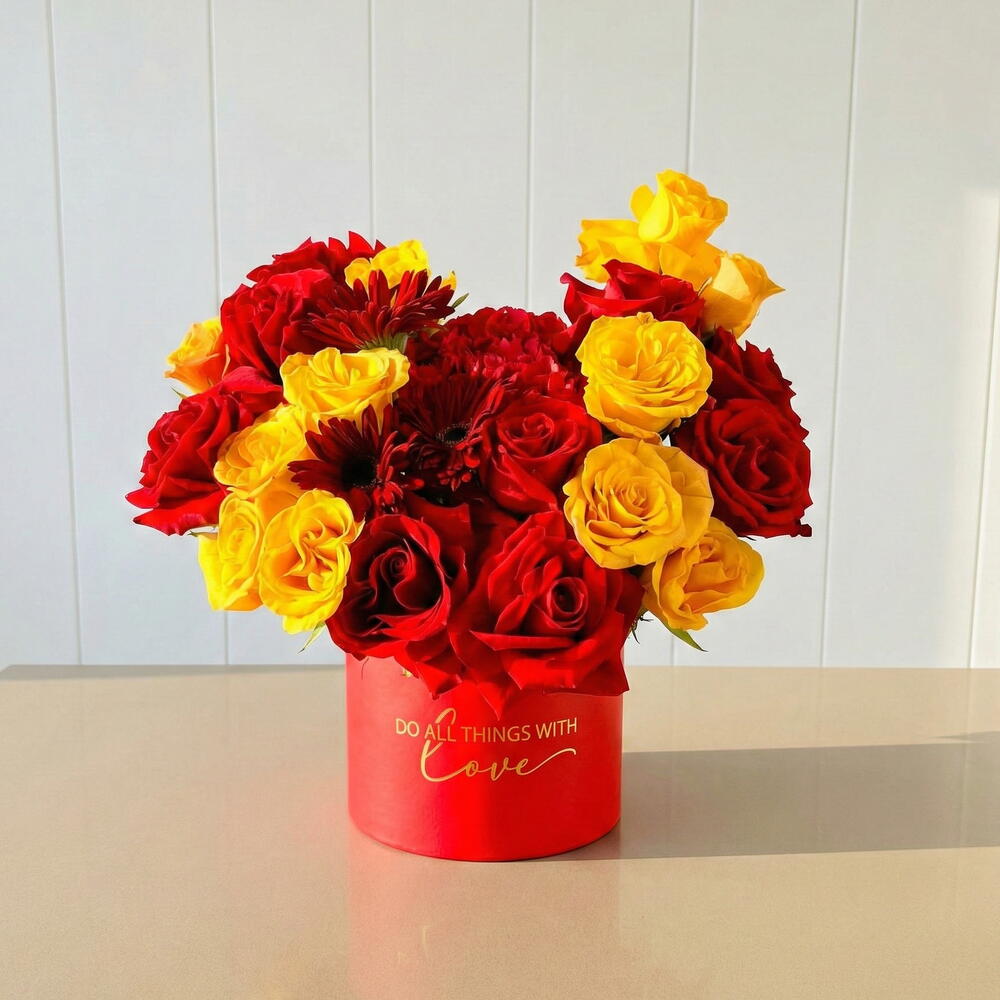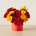 A warm, sunny celebration of red roses and gerberas, softened by hydrangeas and lush foliage. Rose Brighton (11 pcs), Gerbera Red (3 pcs), Premium Ecuador Red Rose (9 pcs), Hydrangea Red (1 pcs), Blad Pistachio (3 pcs) tags: sunshine bouquet UAE, red rose and gerbera, sunny glow flowers