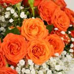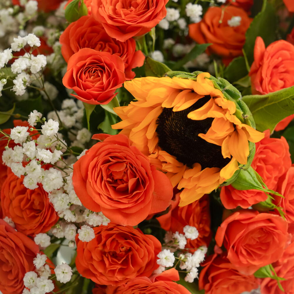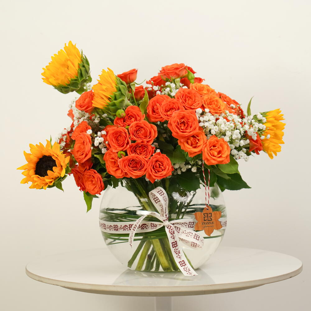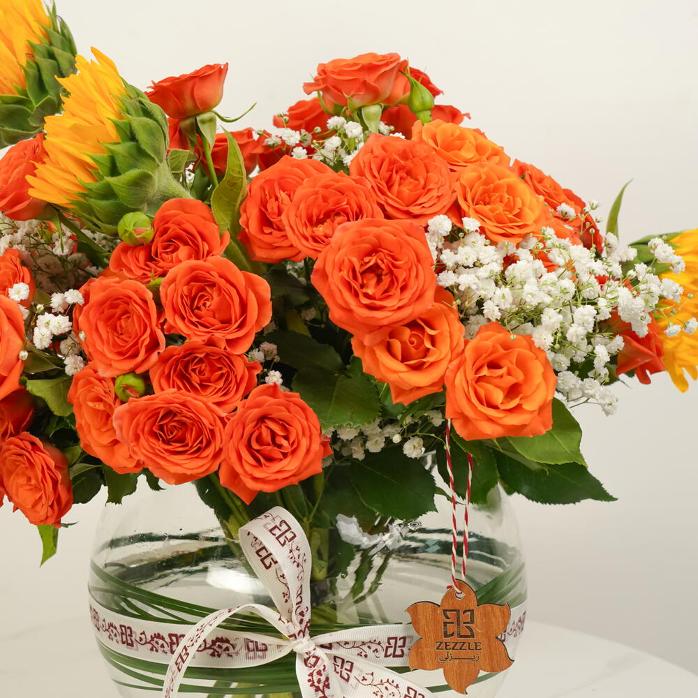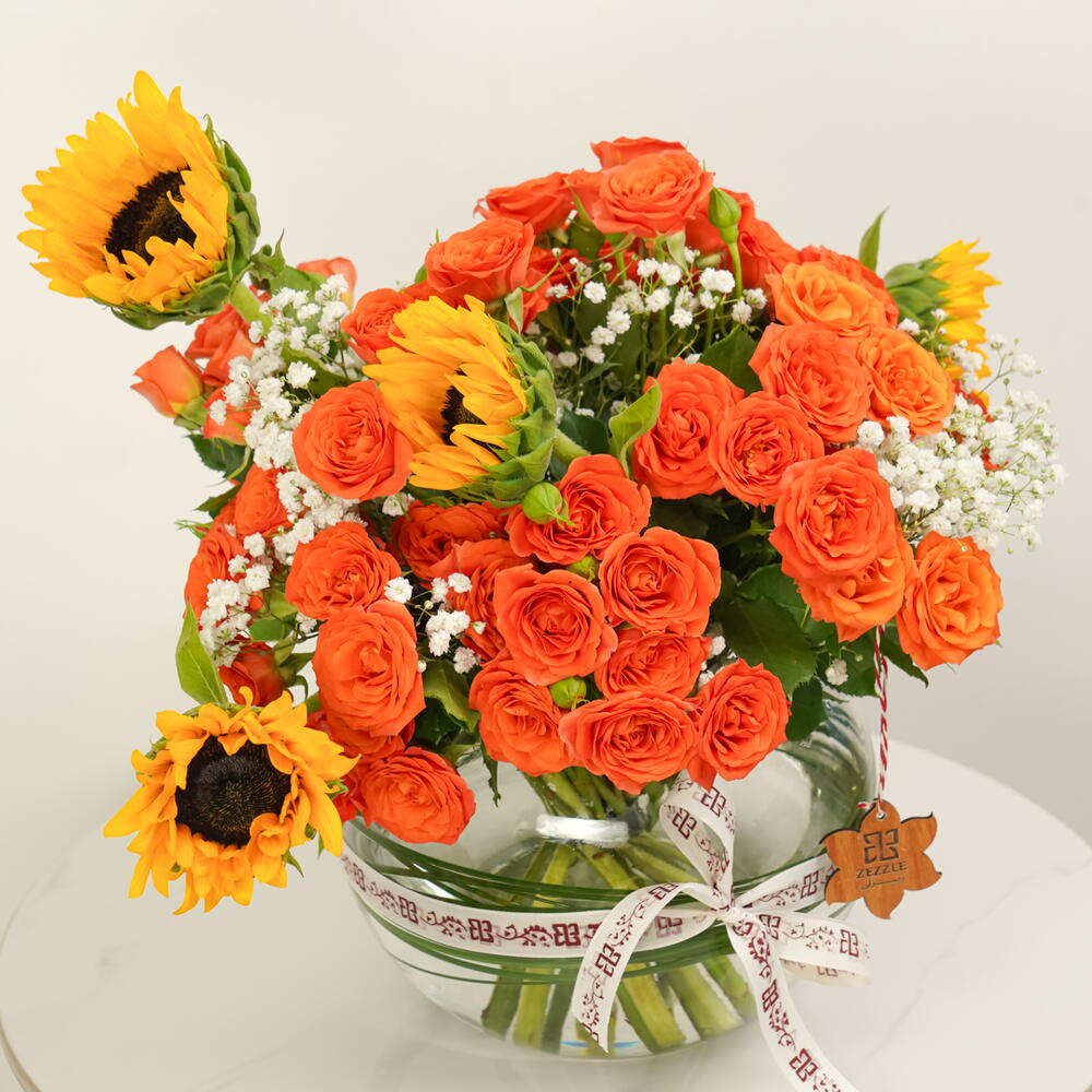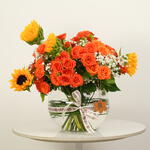 A vibrant floral arrangement featuring 20 orange spray roses, 5 bright sunflowers, and 5 stems of delicate white gypsophila inside a glass bowl. A cheerful blend of sunshine and elegance, perfect for any occasion.