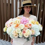 A stunning, large box arrangement featuring the lush textures of Hydrangea, delicate Roses, and graceful Eustoma. This elegant composition evokes feelings of calm, joy, and warmth, making it the perfect gift to express gratitude or admiration. Ideal for birthdays, Mothers Day, housewarmings, or to simply brighten someones day.