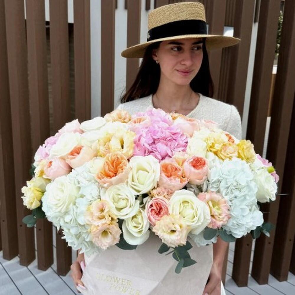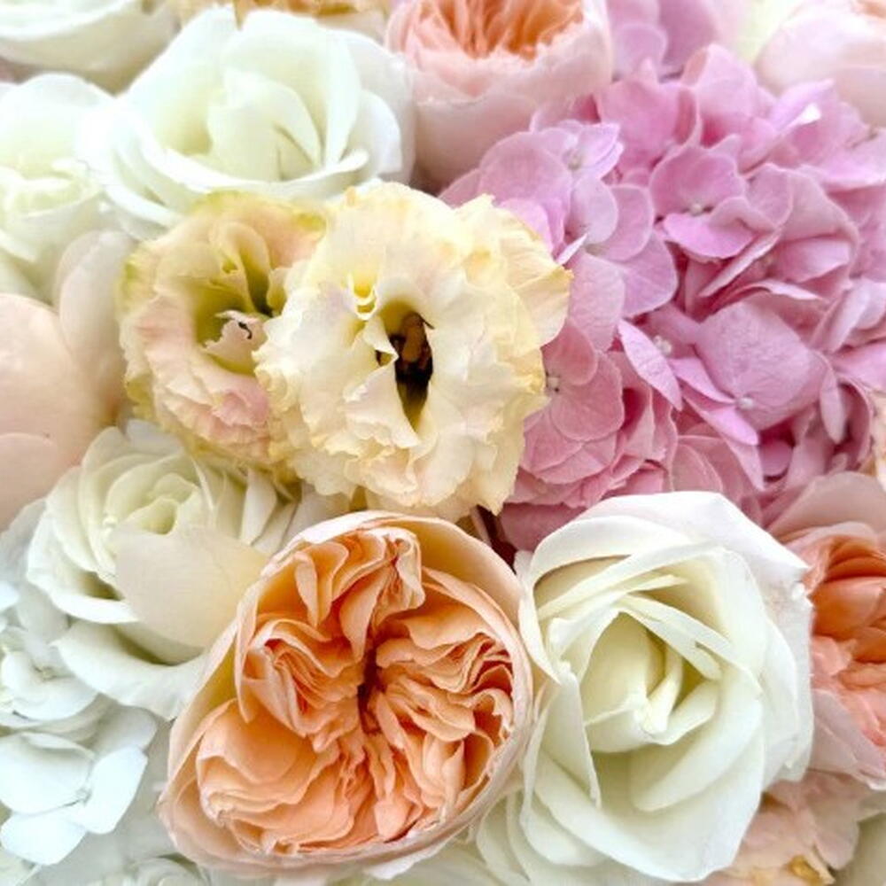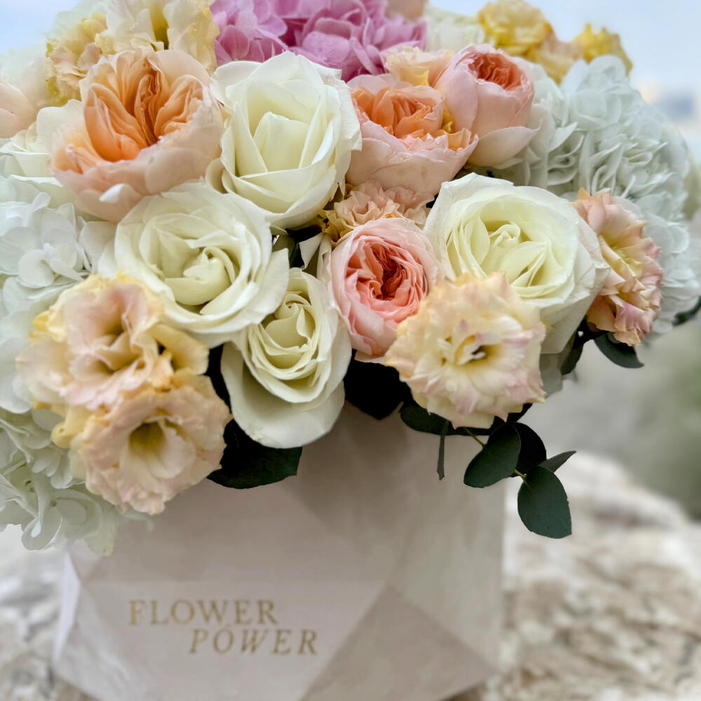 A stunning, large box arrangement featuring the lush textures of Hydrangea, delicate Roses, and graceful Eustoma. This elegant composition evokes feelings of calm, joy, and warmth, making it the perfect gift to express gratitude or admiration. Ideal for birthdays, Mothers Day, housewarmings, or to simply brighten someones day.