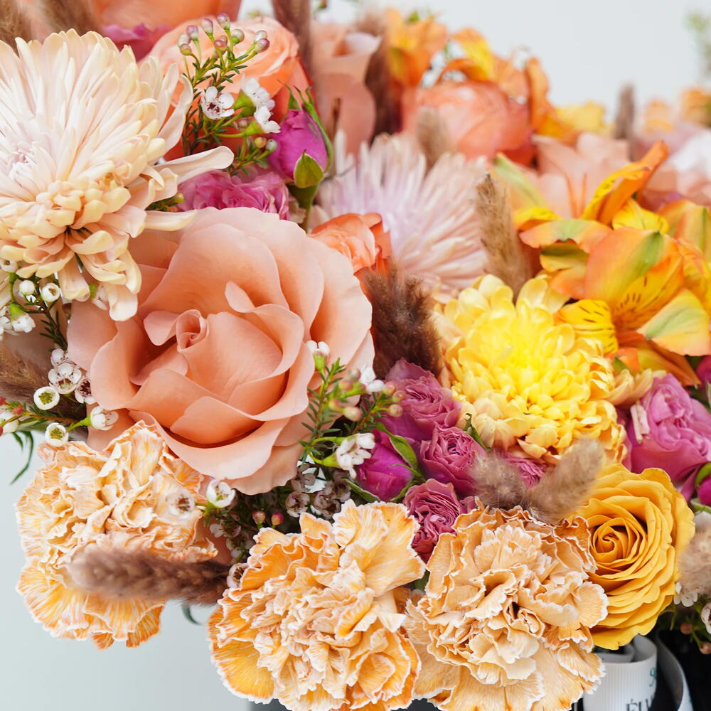 Chrysanthemum - 5 pcs orange carnation - 5 pcs mix roses - 30 pcs astromenia - 5 pcs