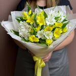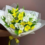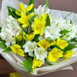 Bask in the warmth of our Alstroemeria Bouquet, where delicate white and vibrant yellow alstroemerias intertwine in a joyful symphony of colors. This arrangement radiates optimism and charm, making it an ideal choice to brighten someones day or celebrate lifes special moments.