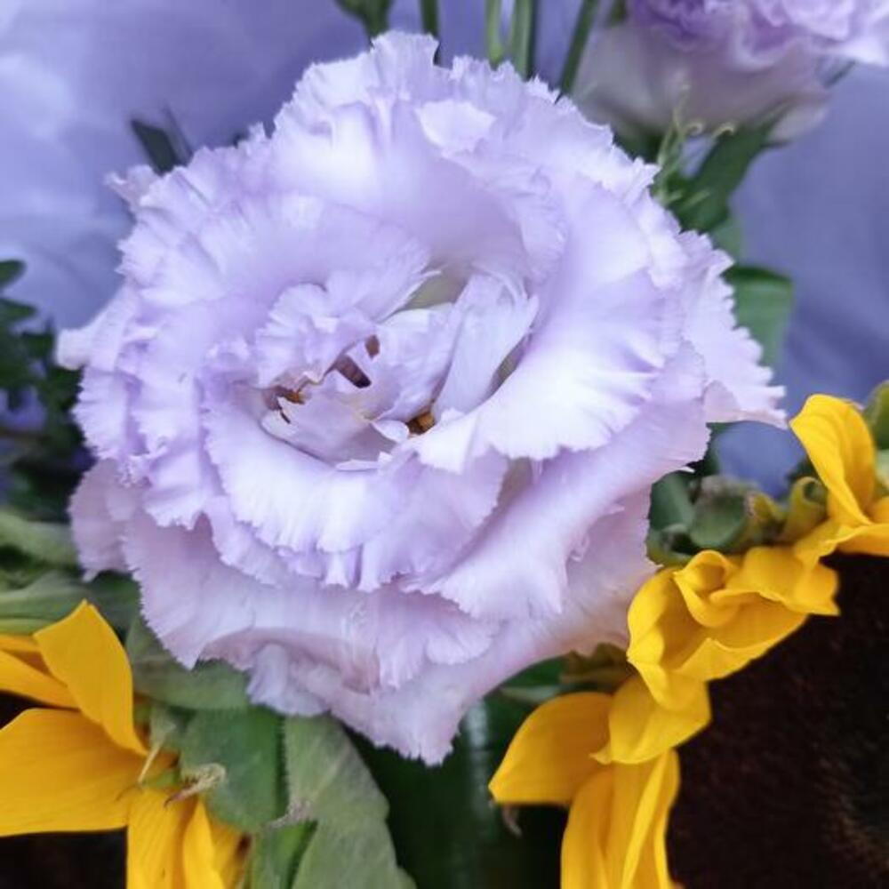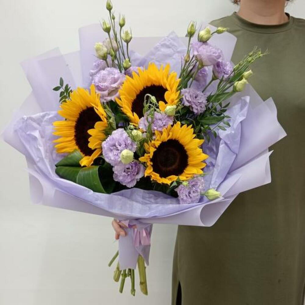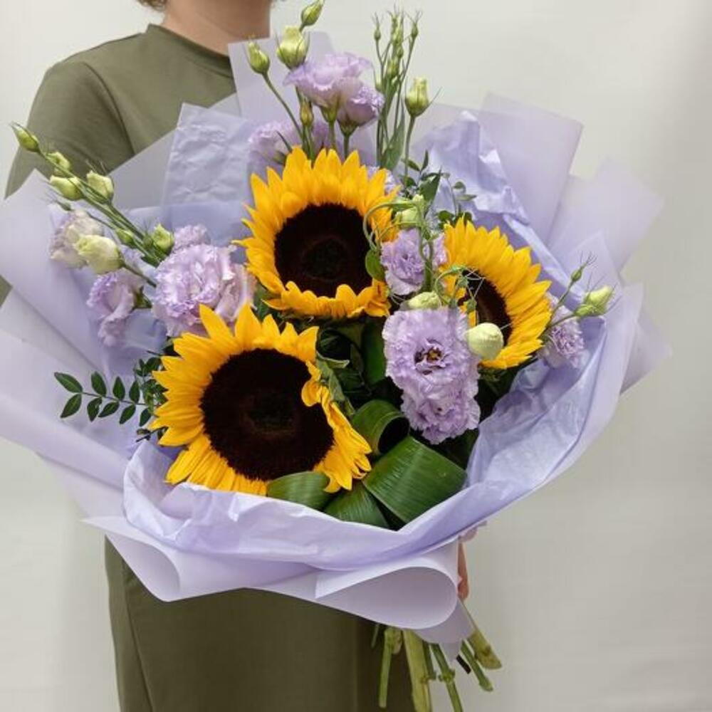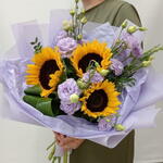 Presenting the Sunny Elegance bouquet, an exquisite arrangement of vibrant sunflowers paired with delicate lavender lisianthus. This beautiful combination creates a striking contrast that is both joyful and sophisticated. The bold, cheerful sunflowers bring a touch of warmth and happiness, while the soft, graceful lavender lisianthus adds elegance and charm. Perfect for any occasion, this bouquet is a wonderful way to brighten someones day and make a lasting impression. Give the Sunny Elegance bouquet to express your heartfelt sentiments with a blend of bold and delicate blooms. This stunning arrangement is sure to delight and enchant its recipient.