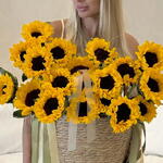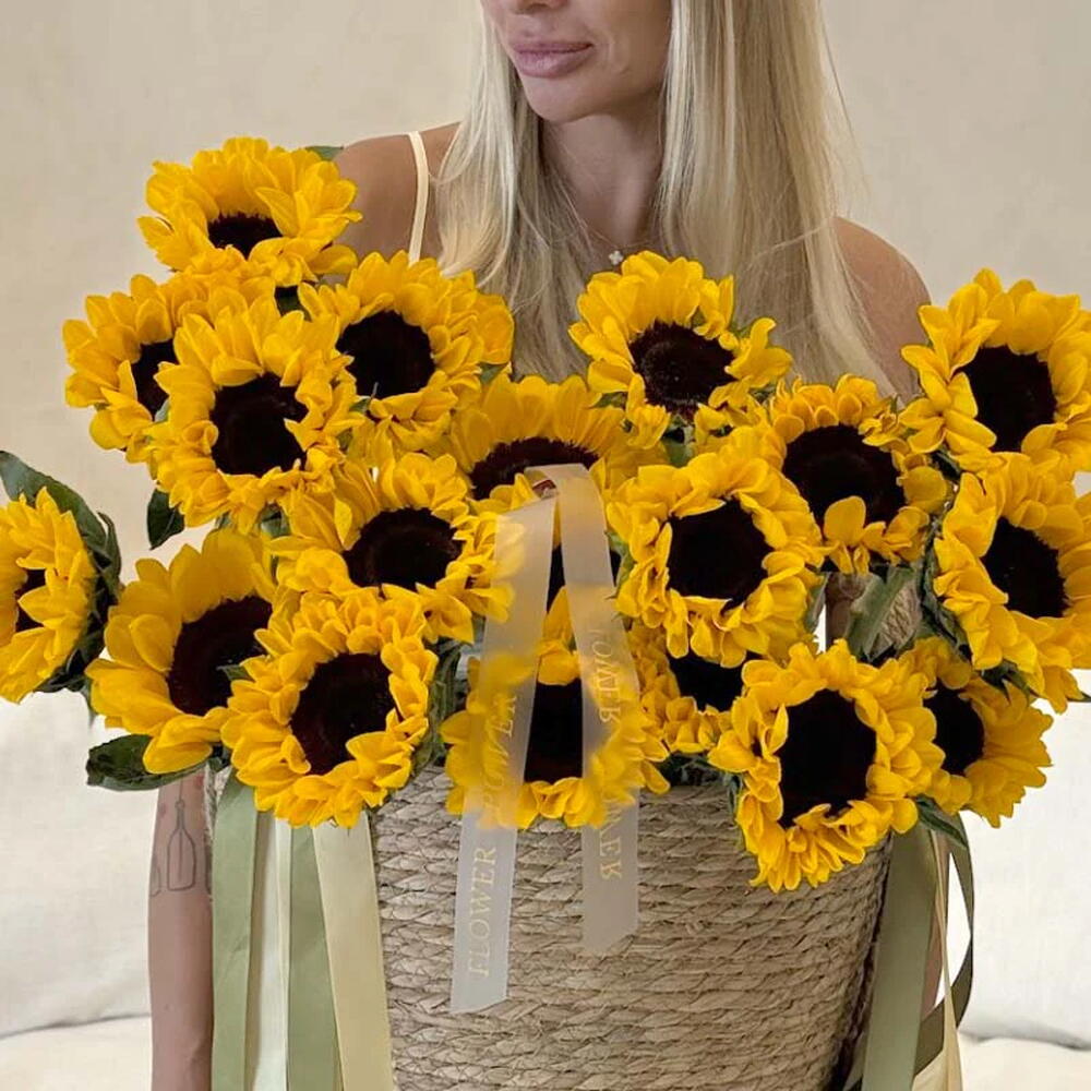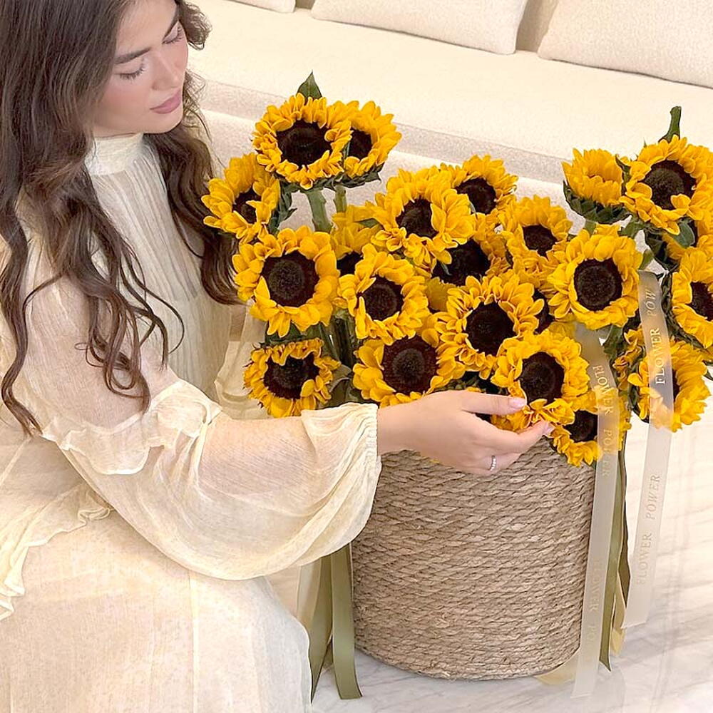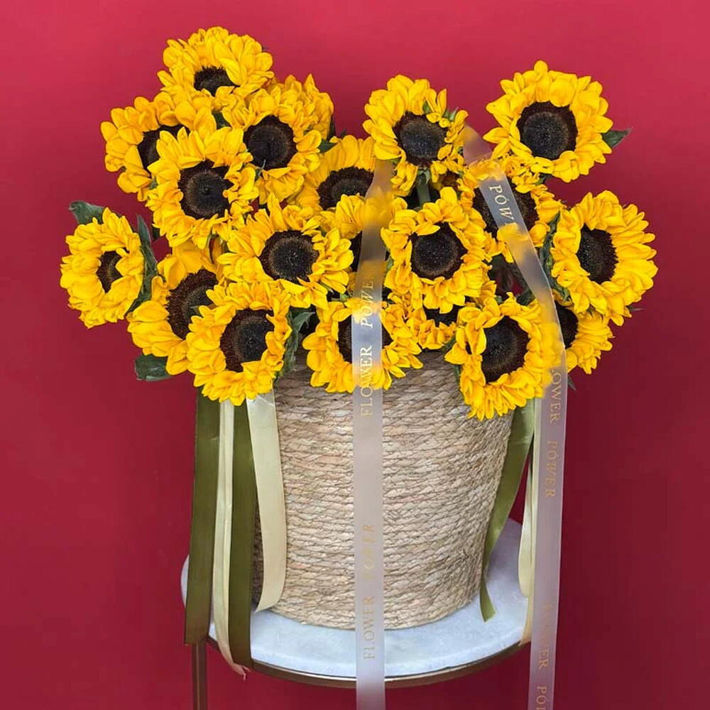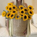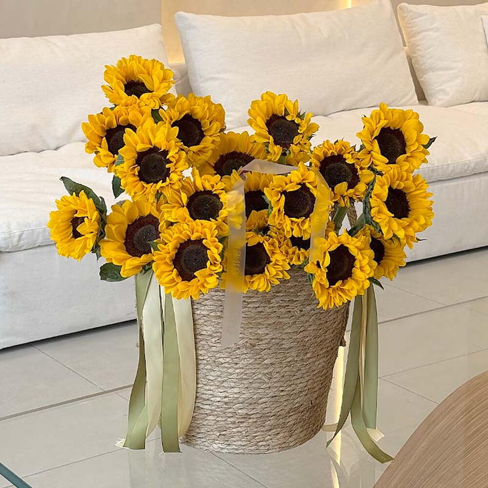 A bright and luxurious arrangement of radiant Sunflowers, meticulously placed in a charming natural rope basket. This arrangement, the Sunny Ritual, is the ultimate symbol of happiness, energy, and optimism—a stunning uplifting gift perfect for birthdays, housewarmings, or corporate gestures.