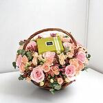 Basket - 1 pcs Wax flower - 5 pcs baby rose pink - 8 pcs chocolate patchi - 1 pcs peach spray roses - 10 pcs eucalyptus greens - 5 pcs