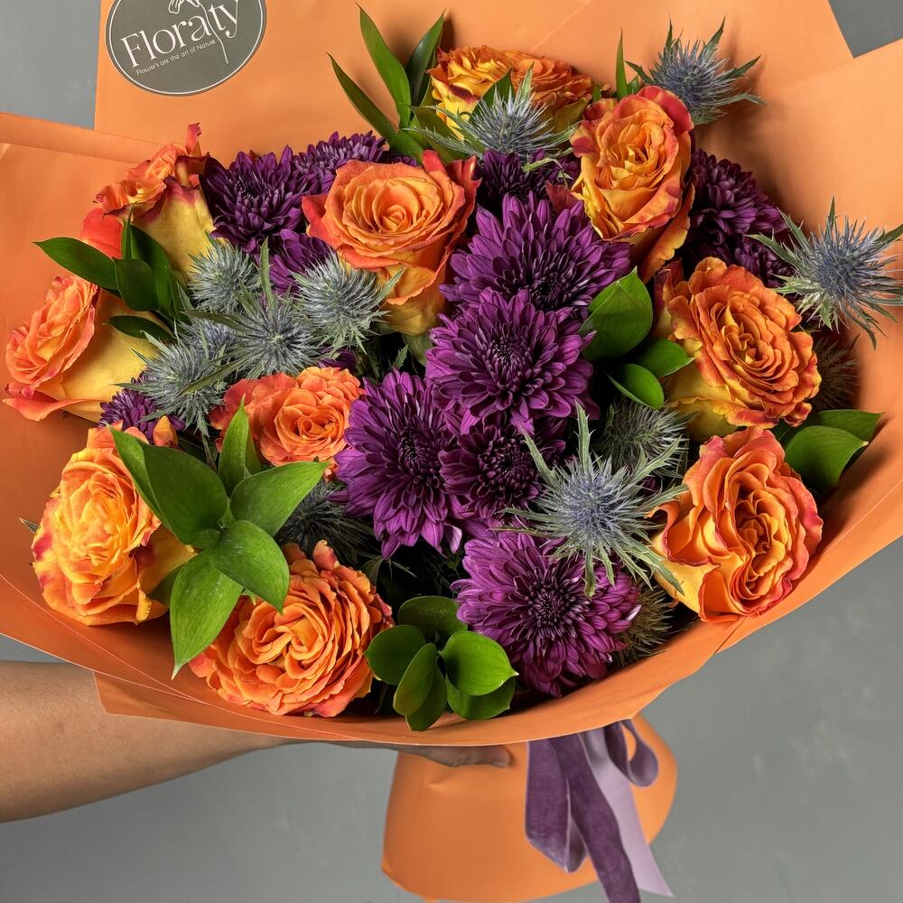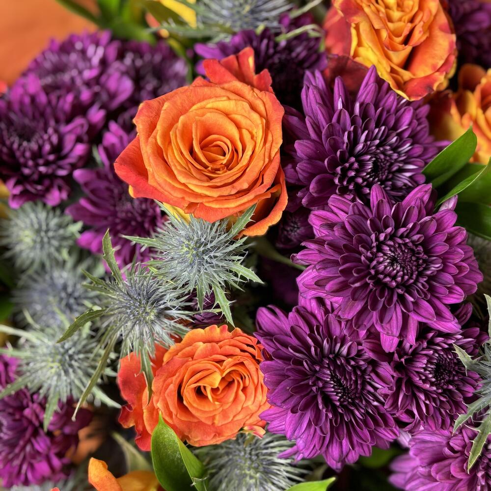 Where the sky melts into fire, Sunset Blooms is born. Fiery orange roses evoke passion and vitality, while plum chrysanthemums ground the spirit in calm strength. Spiked blue thistles add a hint of wild dusk energy—like twilight’s final spark. This bouquet captures the fleeting beauty of a day’s golden end, wrapped in nature’s boldest hues.
