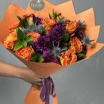 chrysanthemum dark purple - 5 pcs orange roses - 10 pcs thisle - 5 pcs