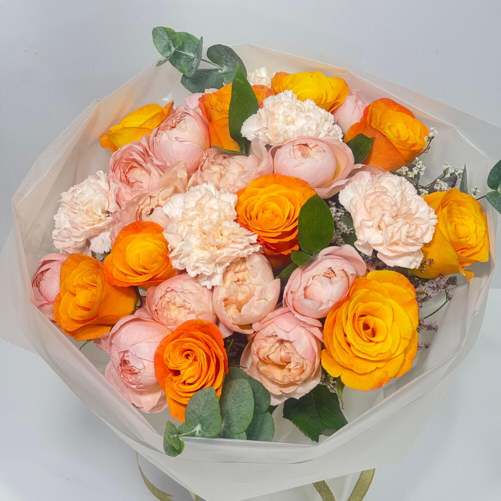 carnation - 3 pcs orange rose - 10 pcs peony type rose - 5 pcs