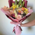 This vibrant bouquet combines tenderness and brightness in one elegant arrangement. Soft pastel roses blend harmoniously with sunny yellow chrysanthemums and unopened lily buds, creating a composition full of freshness and energy. Accented with delicate limonium and wrapped in stylish burgundy and pink paper, it is perfect for birthdays, celebrations, or simply to bring joy. To prolong its beauty, place the bouquet in clean water, trim the stems every 2 days, and keep it away from direct sunlight or heat sources.