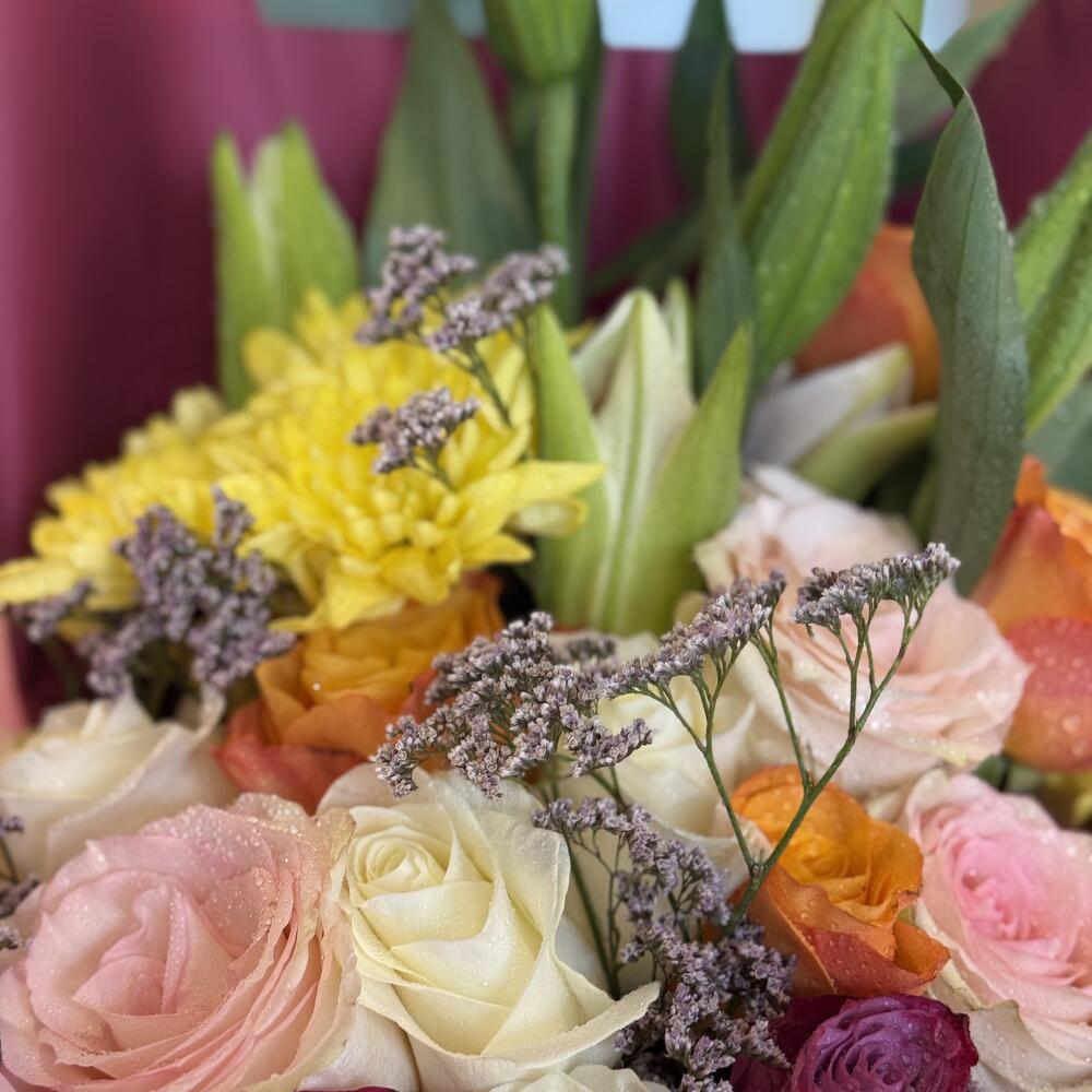 Limonium - 4 pcs Pink rose - 3 pcs White rose - 4 pcs White lilies - 2 pcs yellow chrysanthemum - 3 pcs purple rose - 4 pcs peach rose - 6 pcs