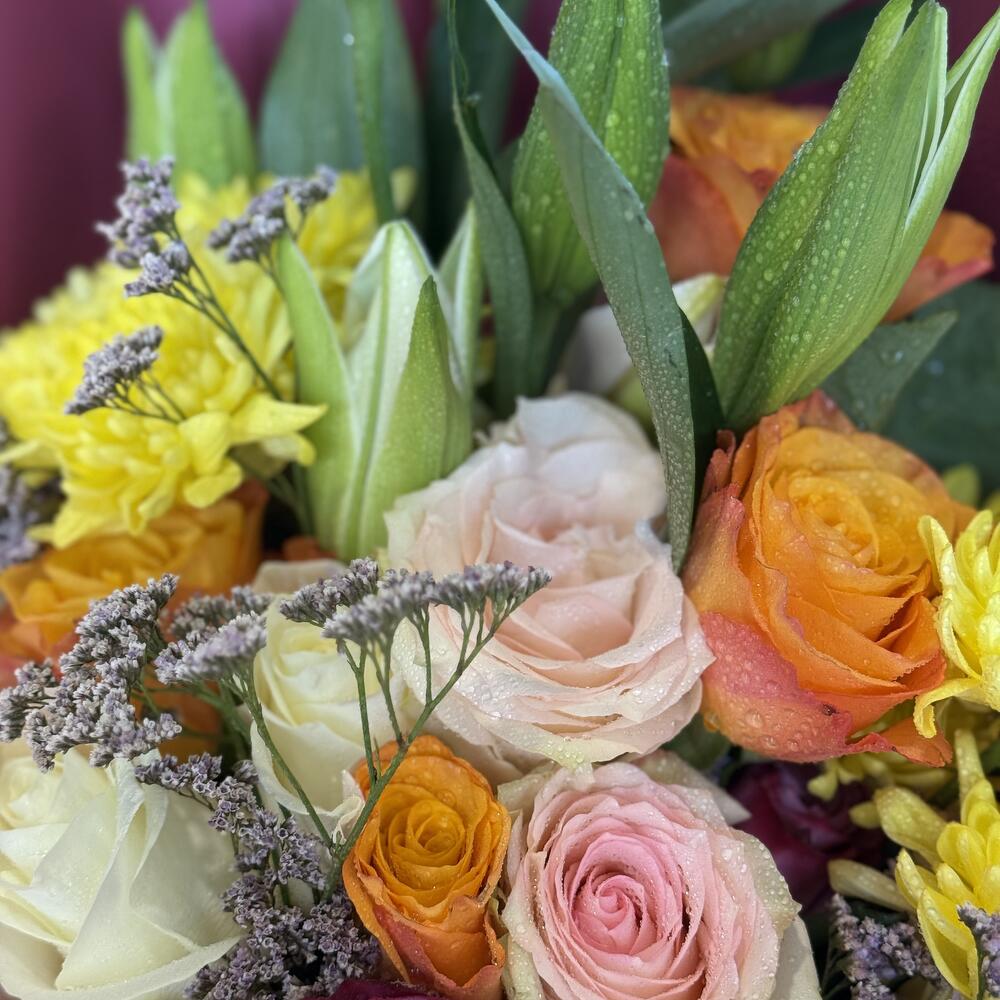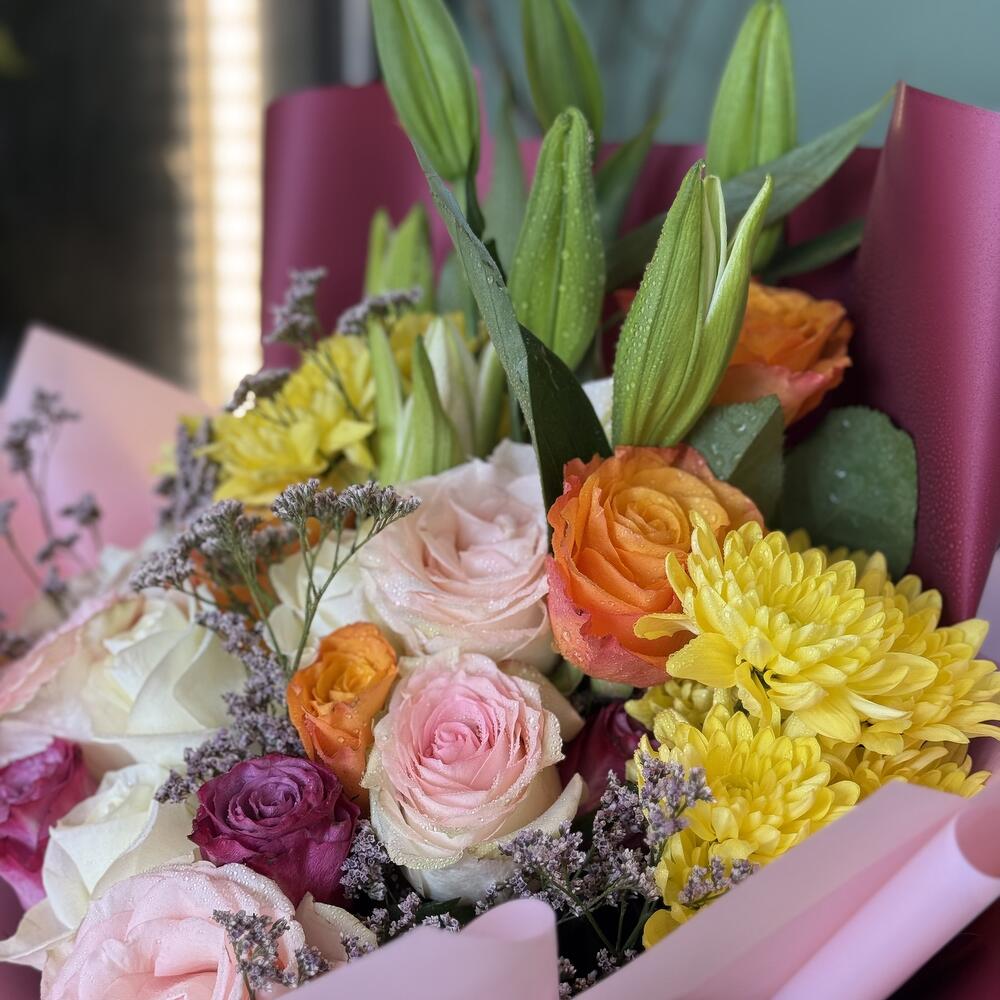 This vibrant bouquet combines tenderness and brightness in one elegant arrangement. Soft pastel roses blend harmoniously with sunny yellow chrysanthemums and unopened lily buds, creating a composition full of freshness and energy. Accented with delicate limonium and wrapped in stylish burgundy and pink paper, it is perfect for birthdays, celebrations, or simply to bring joy. To prolong its beauty, place the bouquet in clean water, trim the stems every 2 days, and keep it away from direct sunlight or heat sources.